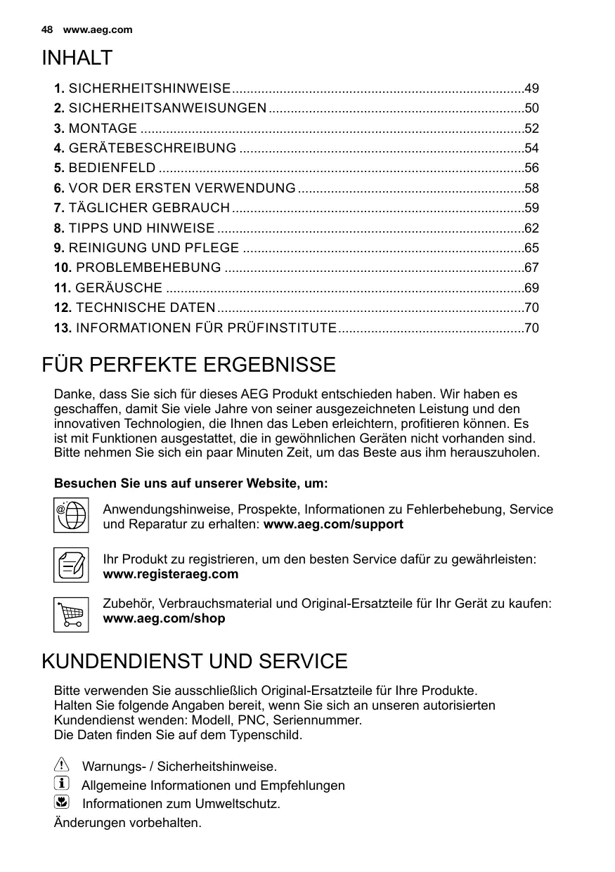 Danke, dass Sie sich für dieses AEG Produkt entschieden haben. Wir haben es geschaffen, damit Sie viele Jahre von seiner ausgezeichneten Leistung und den innovativen Technologien, die Ihnen das Leben erleichtern, profitieren können. Es ist mit Funktionen ausgestattet, die in gewöhnlichen Geräten nicht vorhanden sind. Bitte nehmen Sie sich ein paar Minuten Zeit, um das Beste aus ihm herauszuholen. Besuchen Sie uns auf unserer Website, um: Anwendungshinweise, Prospekte, Informationen zu Fehlerbehebung, Service und Reparatur zu erhalten: www.aeg.com/support Ihr Produkt zu registrieren, um den besten Service dafür zu gewährleisten: www.registeraeg.com Zubehör, Verbrauchsmaterial und Original-Ersatzteile für Ihr Gerät zu kaufen: www.aeg.com/shop