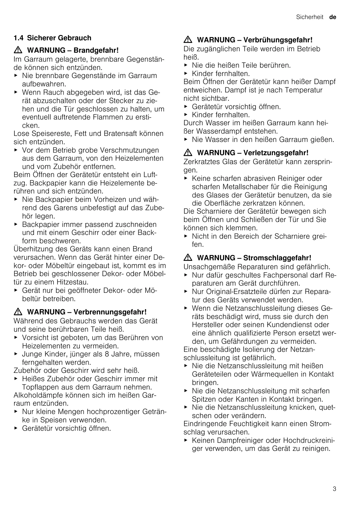 1.4 Sicherer Gebrauch WARNUNG ‒ Brandgefahr! Im Garraum gelagerte, brennbare Gegenstände können sich entzünden. ▶ Nie brennbare Gegenstände im Garraum aufbewahren. ▶ Wenn Rauch abgegeben wird, ist das Gerät abzuschalten oder der Stecker zu ziehen und die Tür geschlossen zu halten, um eventuell auftretende Flammen zu ersticken. Lose Speisereste, Fett und Bratensaft können sich entzünden. ▶ Vor dem Betrieb grobe Verschmutzungen aus dem Garraum, von den Heizelementen und vom Zubehör entfernen. Beim Öffnen der Gerätetür entsteht ein Luftzug. Backpapier kann die Heizelemente berühren und sich entzünden. ▶ Nie Backpapier beim Vorheizen und während des Garens unbefestigt auf das Zubehör legen. ▶ Backpapier immer passend zuschneiden und mit einem Geschirr oder einer Backform beschweren. Überhitzung des Geräts kann einen Brand verursachen. Wenn das Gerät hinter einer Dekor- oder Möbeltür eingebaut ist, kommt es im Betrieb bei geschlossener Dekor- oder Möbeltür zu einem Hitzestau. ▶ Gerät nur bei geöffneter Dekor- oder Möbeltür betreiben. WARNUNG ‒ Verbrennungsgefahr! Während des Gebrauchs werden das Gerät und seine berührbaren Teile heiß. ▶ Vorsicht ist geboten, um das Berühren von Heizelementen zu vermeiden. ▶ Junge Kinder, jünger als 8 Jahre, müssen ferngehalten werden. Zubehör oder Geschirr wird sehr heiß. ▶ Heißes Zubehör oder Geschirr immer mit Topflappen aus dem Garraum nehmen. Alkoholdämpfe können sich im heißen Garraum entzünden. ▶ Nur kleine Mengen hochprozentiger Getränke in Speisen verwenden. ▶ Gerätetür vorsichtig öffnen.