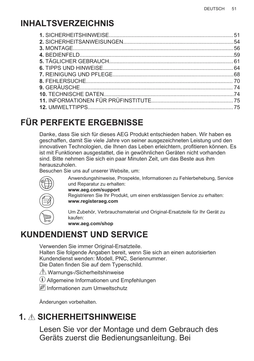 Danke, dass Sie sich für dieses AEG Produkt entschieden haben. Wir haben es geschaffen, damit Sie viele Jahre von seiner ausgezeichneten Leistung und den innovativen Technologien, die Ihnen das Leben erleichtern, profitieren können. Es ist mit Funktionen ausgestattet, die in gewöhnlichen Geräten nicht vorhanden sind. Bitte nehmen Sie sich ein paar Minuten Zeit, um das Beste aus ihm herauszuholen. Besuchen Sie uns auf unserer Website, um: Anwendungshinweise, Prospekte, Informationen zu Fehlerbehebung, Service und Reparatur zu erhalten: www.aeg.com/support Registrieren Sie Ihr Produkt, um einen erstklassigen Service zu erhalten: www.registeraeg.com Um Zubehör, Verbrauchsmaterial und Original-Ersatzteile für Ihr Gerät zu kaufen: www.aeg.com/shop