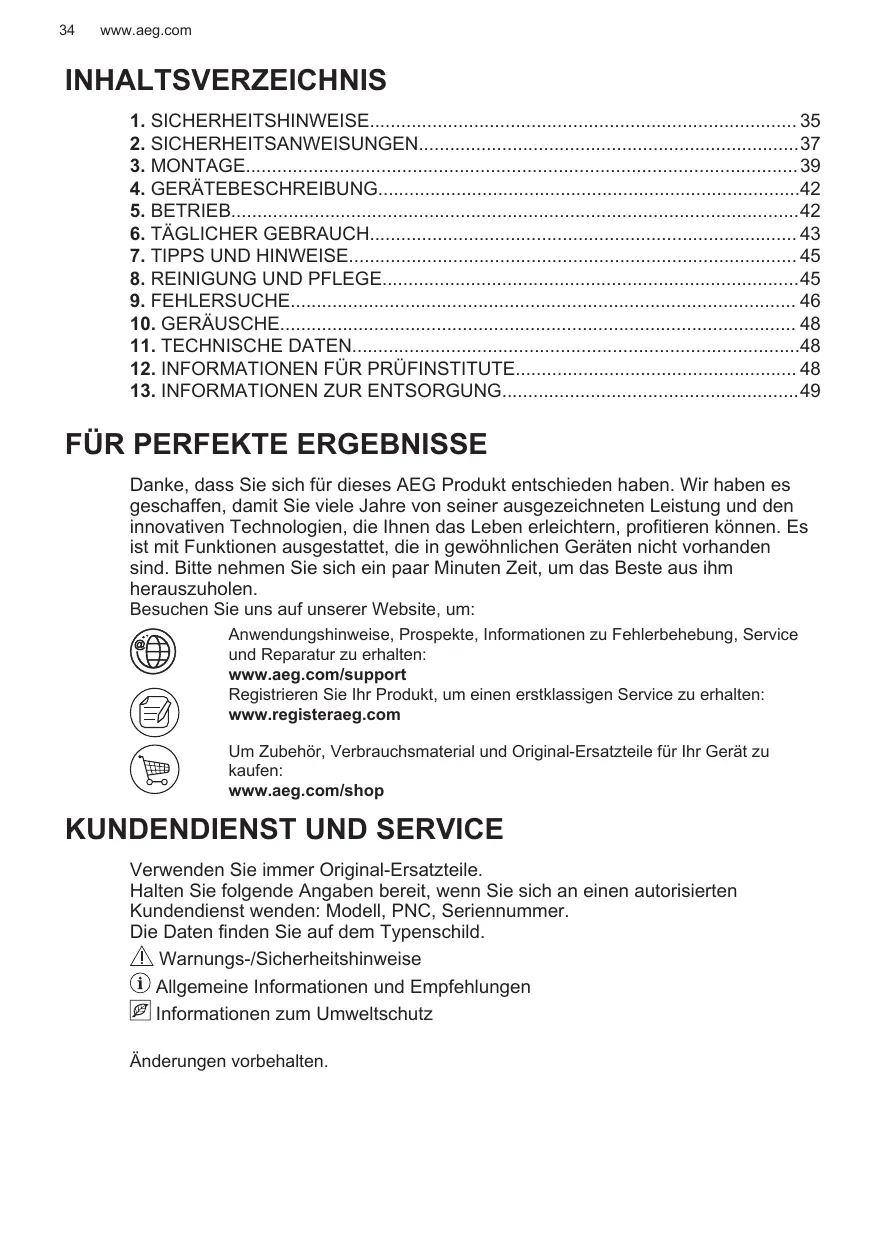 Danke, dass Sie sich für dieses AEG Produkt entschieden haben. Wir haben es geschaffen, damit Sie viele Jahre von seiner ausgezeichneten Leistung und den innovativen Technologien, die Ihnen das Leben erleichtern, profitieren können. Es ist mit Funktionen ausgestattet, die in gewöhnlichen Geräten nicht vorhanden sind. Bitte nehmen Sie sich ein paar Minuten Zeit, um das Beste aus ihm herauszuholen. Besuchen Sie uns auf unserer Website, um: Anwendungshinweise, Prospekte, Informationen zu Fehlerbehebung, Service und Reparatur zu erhalten: www.aeg.com/support Registrieren Sie Ihr Produkt, um einen erstklassigen Service zu erhalten: www.registeraeg.com Um Zubehör, Verbrauchsmaterial und Original-Ersatzteile für Ihr Gerät zu kaufen: www.aeg.com/shop
