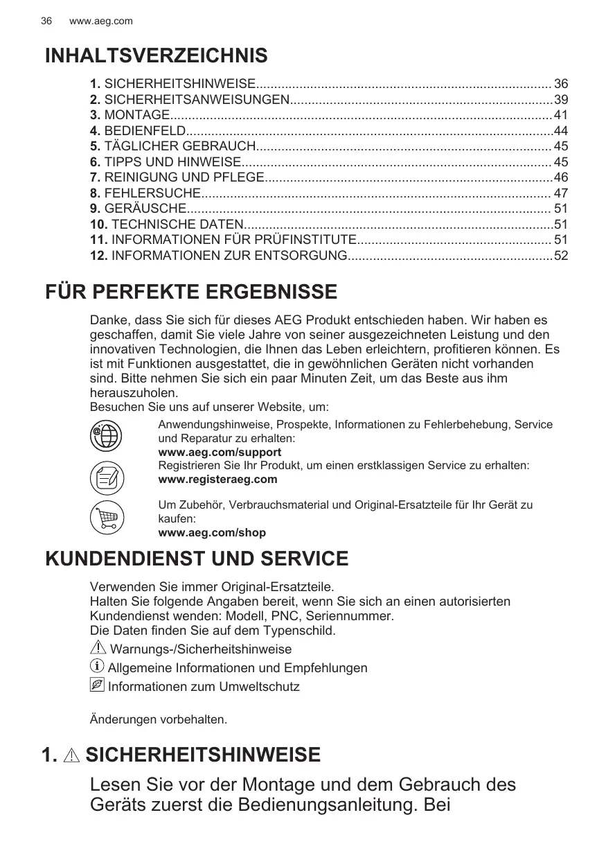 Danke, dass Sie sich für dieses AEG Produkt entschieden haben. Wir haben es geschaffen, damit Sie viele Jahre von seiner ausgezeichneten Leistung und den innovativen Technologien, die Ihnen das Leben erleichtern, profitieren können. Es ist mit Funktionen ausgestattet, die in gewöhnlichen Geräten nicht vorhanden sind. Bitte nehmen Sie sich ein paar Minuten Zeit, um das Beste aus ihm herauszuholen. Besuchen Sie uns auf unserer Website, um: Anwendungshinweise, Prospekte, Informationen zu Fehlerbehebung, Service und Reparatur zu erhalten: www.aeg.com/support Registrieren Sie Ihr Produkt, um einen erstklassigen Service zu erhalten: www.registeraeg.com Um Zubehör, Verbrauchsmaterial und Original-Ersatzteile für Ihr Gerät zu kaufen: www.aeg.com/shop