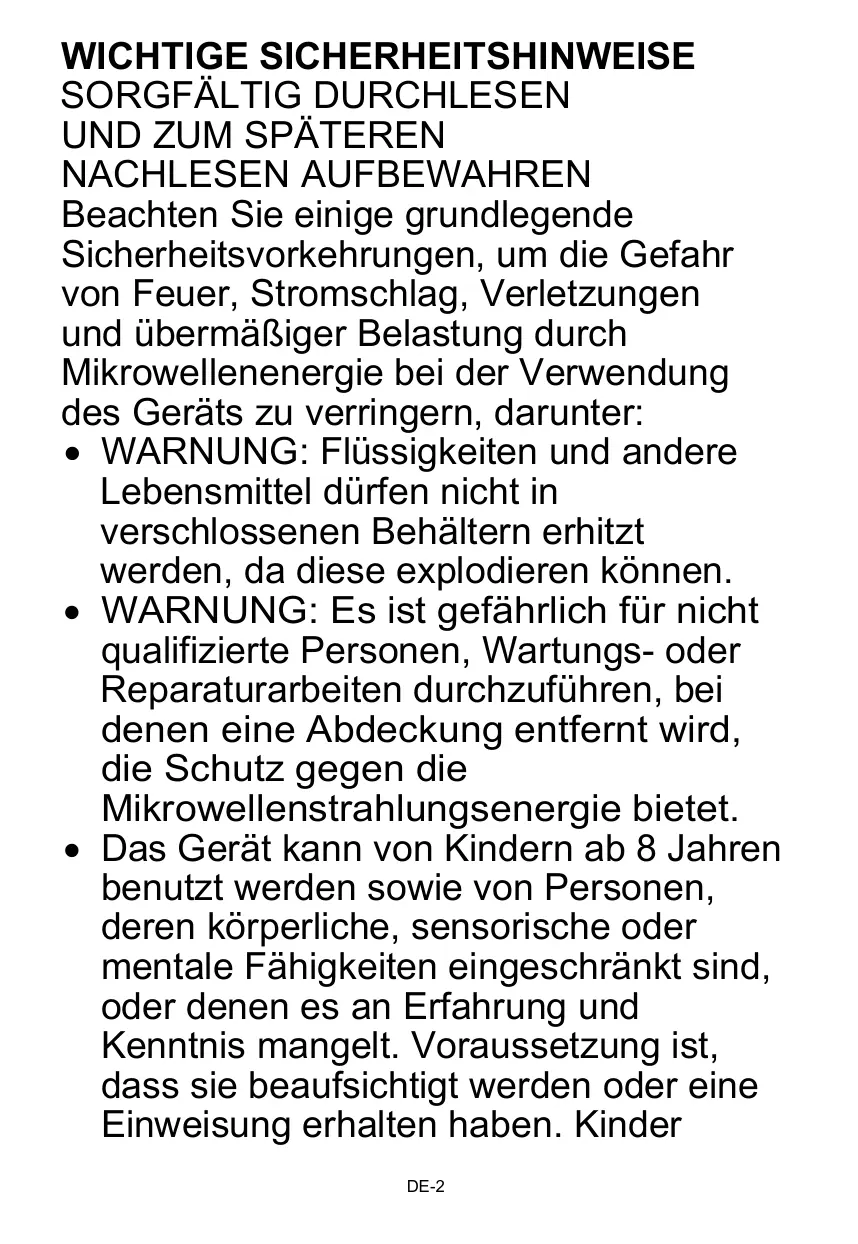 12 rue Jules Ferry - 93110 Rosny-Sous-Bois, FRANCE WICHTIGE SICHERHEITSHINWEISE SORGFÄLTIG DURCHLESEN UND ZUM SPÄTEREN NACHLESEN AUFBEWAHREN Beachten Sie einige grundlegende Sicherheitsvorkehrungen, um die Gefahr von Feuer, Stromschlag, Verletzungen und übermäßiger Belastung durch Mikrowellenenergie bei der Verwendung des Geräts zu verringern, darunter: • WARNUNG: Flüssigkeiten und andere Lebensmittel dürfen nicht in verschlossenen Behältern erhitzt werden, da diese explodieren können. • WARNUNG: Es ist gefährlich für nicht qualifizierte Personen, Wartungs- oder Reparaturarbeiten durchzuführen, bei denen eine Abdeckung entfernt wird, die Schutz gegen die Mikrowellenstrahlungsenergie bietet. • Das Gerät kann von Kindern ab 8 Jahren benutzt werden sowie von Personen, deren körperliche, sensorische oder mentale Fähigkeiten eingeschränkt sind, oder denen es an Erfahrung und Kenntnis mangelt. Voraussetzung ist, dass sie beaufsichtigt werden oder eine Einweisung erhalten haben. Kinder DE-2