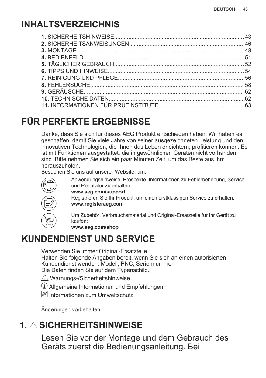 Danke, dass Sie sich für dieses AEG Produkt entschieden haben. Wir haben es geschaffen, damit Sie viele Jahre von seiner ausgezeichneten Leistung und den innovativen Technologien, die Ihnen das Leben erleichtern, profitieren können. Es ist mit Funktionen ausgestattet, die in gewöhnlichen Geräten nicht vorhanden sind. Bitte nehmen Sie sich ein paar Minuten Zeit, um das Beste aus ihm herauszuholen. Besuchen Sie uns auf unserer Website, um: Anwendungshinweise, Prospekte, Informationen zu Fehlerbehebung, Service und Reparatur zu erhalten: www.aeg.com/support Registrieren Sie Ihr Produkt, um einen erstklassigen Service zu erhalten: www.registeraeg.com Um Zubehör, Verbrauchsmaterial und Original-Ersatzteile für Ihr Gerät zu kaufen: www.aeg.com/shop