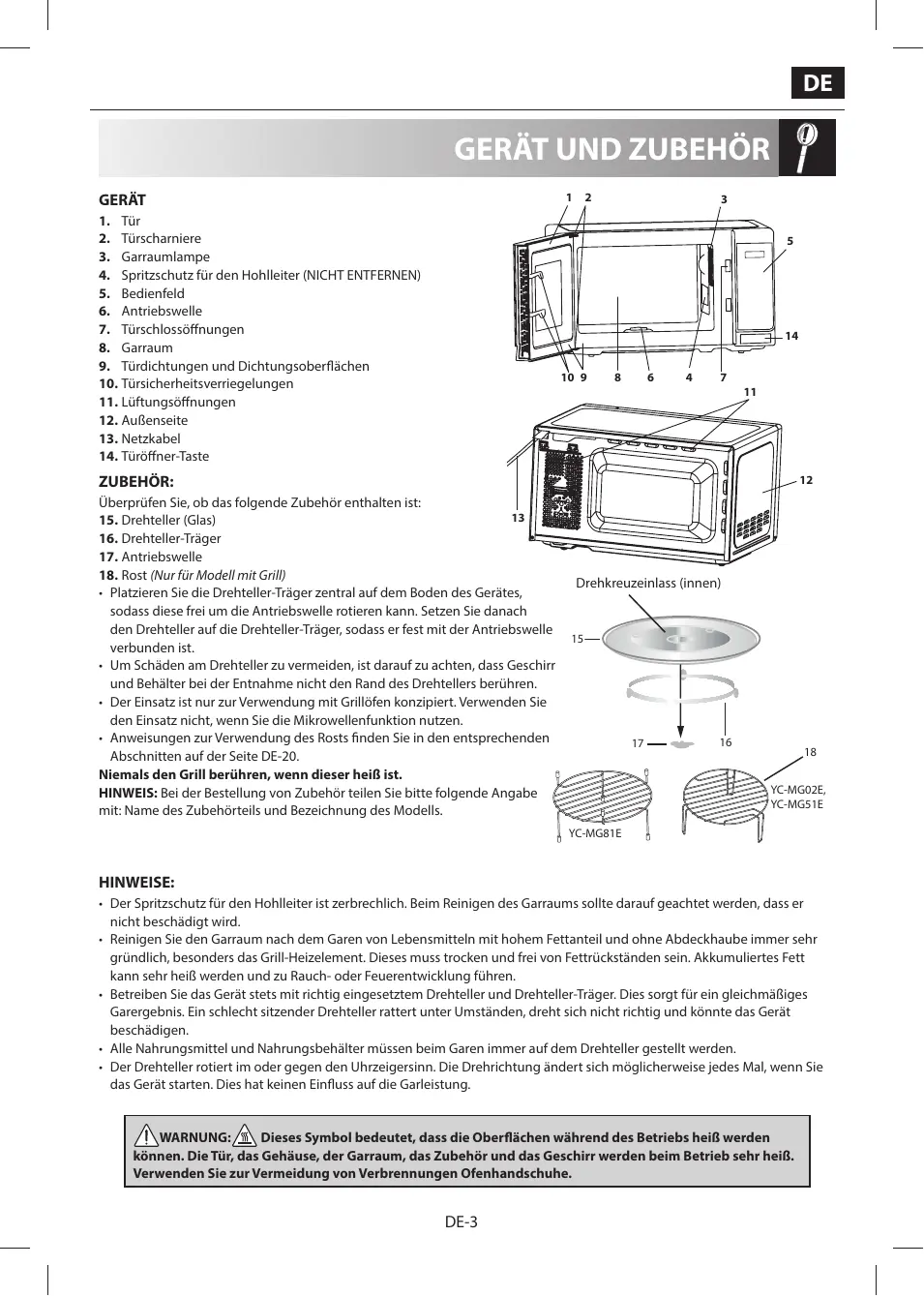 YC-MG51E YC-MG81E HINWEISE: • Der Spritzschutz für den Hohlleiter ist zerbrechlich. Beim Reinigen des Garraums sollte darauf geachtet werden, dass er nicht beschädigt wird. • Reinigen Sie den Garraum nach dem Garen von Lebensmitteln mit hohem Fettanteil und ohne Abdeckhaube immer sehr gründlich, besonders das Grill-Heizelement. Dieses muss trocken und frei von Fettrückständen sein. Akkumuliertes Fett kann sehr heiß werden und zu Rauch- oder Feuerentwicklung führen. • Betreiben Sie das Gerät stets mit richtig eingesetztem Drehteller und Drehteller-Träger. Dies sorgt für ein gleichmäßiges Garergebnis. Ein schlecht sitzender Drehteller rattert unter Umständen, dreht sich nicht richtig und könnte das Gerät beschädigen. • Alle Nahrungsmittel und Nahrungsbehälter müssen beim Garen immer auf dem Drehteller gestellt werden. • Der Drehteller rotiert im oder gegen den Uhrzeigersinn. Die Drehrichtung ändert sich möglicherweise jedes Mal, wenn Sie das Gerät starten. Dies hat keinen Einfluss auf die Garleistung.