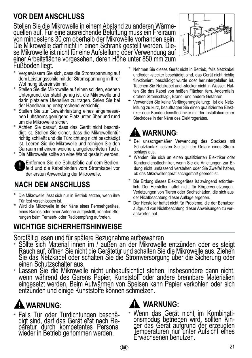 * Non accendere l'apparecchio se il cavo di alimenta- Compruebe que la puerta del horno microondas se cierra perfectamente sobre su soporte y que la junta interna de la puerta está en buenas condiciones. Vacíe el horno microondas y limpie su interior con un paño suave humedecido. El horno microondas se debe colocar contra la pared. Antes de utilizar el microondas por primera, es recomendable quitar la pellícula protectora del panel de control y la brida del cable de alimentación.