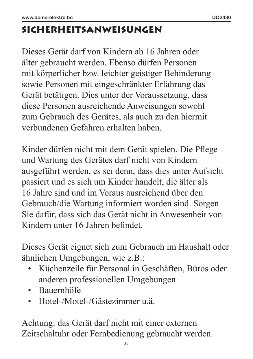 www.domo-elektro.be DO2430 SICHERHEITSANWEISUNGEN Dieses Gerät darf von Kindern ab 16 Jahren oder älter gebraucht werden. Ebenso dürfen Personen mit körperlicher bzw. leichter geistiger Behinderung sowie Personen mit eingeschränkter Erfahrung das Gerät betätigen. Dies unter der Voraussetzung, dass diese Personen ausreichende Anweisungen sowohl zum Gebrauch des Gerätes, als auch zu den hiermit verbundenen Gefahren erhalten haben. Kinder dürfen nicht mit dem Gerät spielen. Die Pflege und Wartung des Gerätes darf nicht von Kindern ausgeführt werden, es sei denn, dass dies unter Aufsicht passiert und es sich um Kinder handelt, die älter als 16 Jahre sind und im Voraus ausreichend über den Gebrauch/die Wartung informiert worden sind. Sorgen Sie dafür, dass sich das Gerät nicht in Anwesenheit von Kindern unter 16 Jahren befindet. Dieses Gerät eignet sich zum Gebrauch im Haushalt oder ähnlichen Umgebungen, wie z.B.: