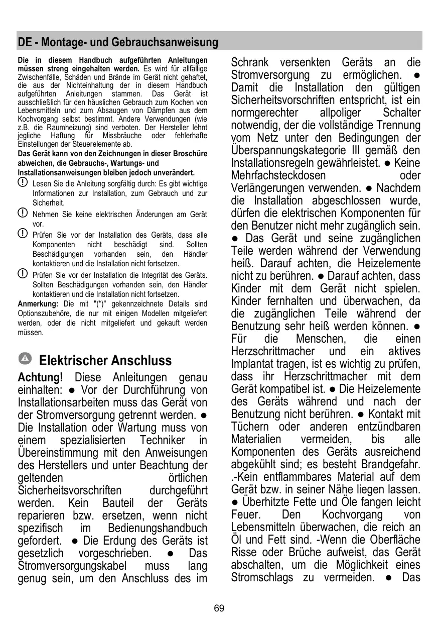 Nous déclinons toute responsabilité pour tout problème, dommage ou incendie causé à l'appareil suite au non-respect des instructions reportées dans ce manuel. L'appareil est destiné exclusivement à un usage domestique pour la cuisson des aliments et l'aspiration des fumées produites par la cuisson. Aucune autre utilisation n'est autorisée (par ex. chauffage de pièces). Le fabricant décline toute responsabilité en cas d’utilisation inappropriée ou de réglage erroné des commandes. L'appareil peut avoir un aspect différent par rapport au dessin de cette notice mais les instructions pour l'utilisation, l'entretien et l'installation restent les mêmes. Lire attentivement les instructions : elles contiennent des informations importantes sur l’installation, sur l’utilisation et sur la sécurité. Ne pas effectuer de modifications électriques sur l’appareil. Avant de procéder à l’installation de l’appareil, vérifier qu’aucun composant n’est endommagé. Sinon, contacter le revendeur et ne pas continuer l'installation. Vérifier l'état de l'appareil avant de procéder avec l’installation. Sinon, contacter le revendeur et ne pas continuer l'installation. Remarque : Les pièces marquées du symbole « (*) » sont des accessoires en option fournis uniquement avec certains modèles, ou des pièces non fournies, à acheter.