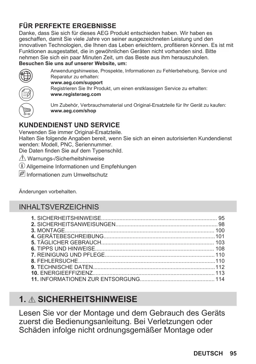Danke, dass Sie sich für dieses AEG Produkt entschieden haben. Wir haben es geschaffen, damit Sie viele Jahre von seiner ausgezeichneten Leistung und den innovativen Technologien, die Ihnen das Leben erleichtern, profitieren können. Es ist mit Funktionen ausgestattet, die in gewöhnlichen Geräten nicht vorhanden sind. Bitte nehmen Sie sich ein paar Minuten Zeit, um das Beste aus ihm herauszuholen. Besuchen Sie uns auf unserer Website, um: Anwendungshinweise, Prospekte, Informationen zu Fehlerbehebung, Service und Reparatur zu erhalten: www.aeg.com/support Registrieren Sie Ihr Produkt, um einen erstklassigen Service zu erhalten: www.registeraeg.com Um Zubehör, Verbrauchsmaterial und Original-Ersatzteile für Ihr Gerät zu kaufen: www.aeg.com/shop