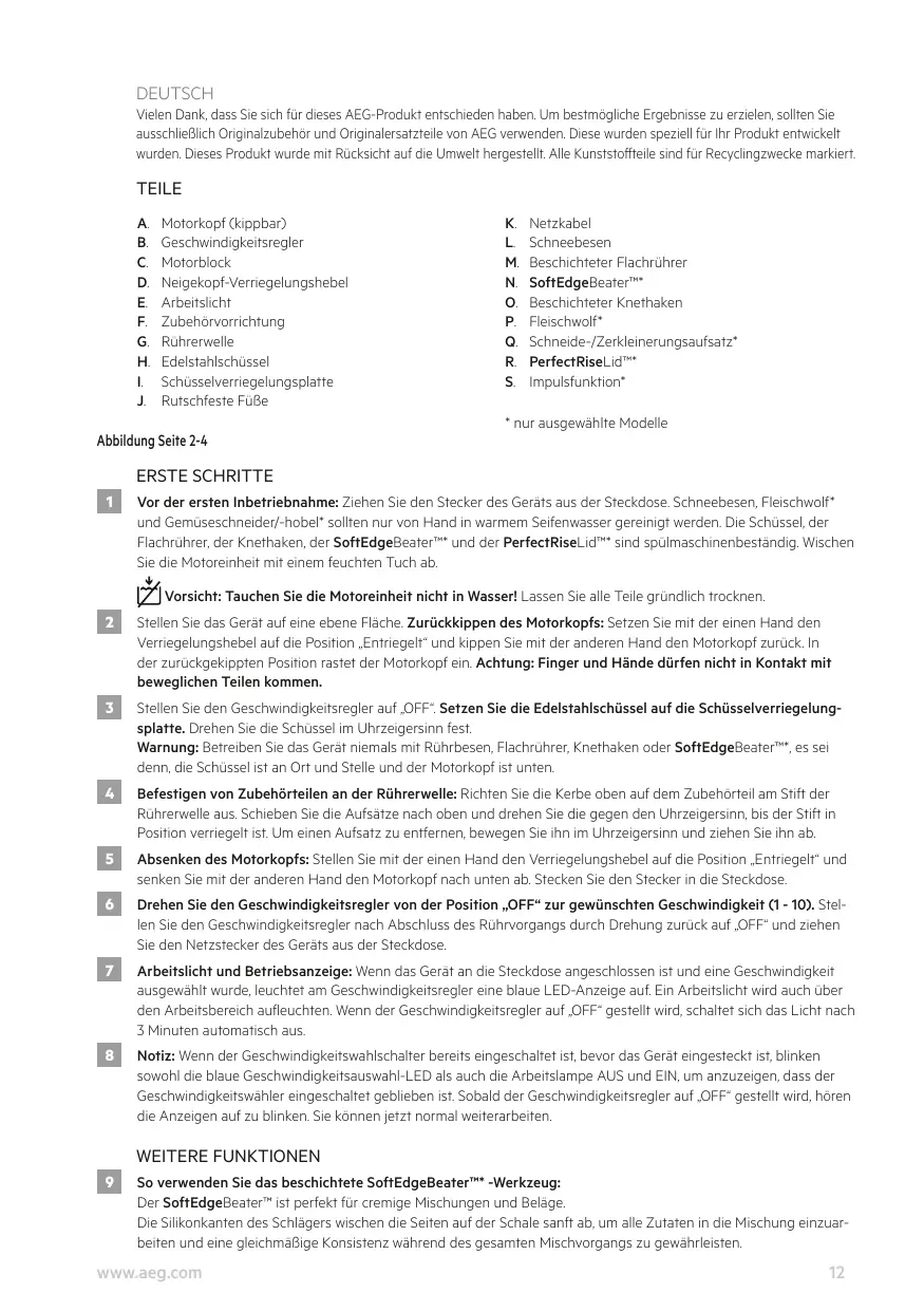 • Soyez prudent lors de la manipulation des lames, qui sont coupantes, lors du vidage du bol et lors du nettoyage. • Cet appareil peut être utilisé par des personnes dont les capacités physiques, sensorielles et mentales sont réduites ou dont les connaissances et l‘expérience sont insuffisantes, à condition d‘être surveillés ou d‘avoir reçu des instructions concernant l‘utilisation sécurisée de l‘appareil et de comprendre les risques encourus. • Les enfants ne doivent pas jouer avec l‘appareil. • L’appareil doit être branché sur un réseau électrique correspondant à la tension et à la fréquence d’alimentation indiquées sur la plaque signalétique. • Ne jamais utiliser ou mettre en marche l’appareil si – le cordon d’alimentation est endommagé ; – le corps de l’appareil est endommagé. • Si l’appareil ou le cordon d’alimentation est endommagé, il doit être remplacé par le fabricant, l’un de ses réparateurs ou toute autre personne dûment qualifiée afin d’éviter tout danger. • L’appareil doit toujours être placé sur une surface de travail plane et horizontale. • Toujours débrancher l’appareil de l’alimentation s’il est laissé sans surveillance et avant assemblage, démontage ou nettoyage. • Cet appareil est réservé à une utilisation à l’intérieur uniquement. • Ne plongez pas l’appareil, son cordon ou sa prise dans l’eau ni dans aucun autre liquide. • Ne laissez pas le cordon d’alimentation dépasser du bord de la table ou du comptoir. Ne le mettez pas en contact avec une surface chaude, notamment sur une cuisinière. • N’utilisez jamais d’accessoires ou pièces faites par un autre fabriquant qui n’est pas recommandé ou vendu ; risque de blessure. • Assurez-vous que le moteur est complètement arrêté avant de démonter et de nettoyer les pièces de l’appareil. • Évitez le contact avec les parties mobiles, qui pourrait provoquer des blessures ! N‘utilisez pas d‘autres outils ni d‘autres ustensiles lors de l‘utilisation de l‘appareil. • Ne quittez pas cet appareil des yeux lorsqu‘il est en marche. • Assurez-vous de tenir à l‘écart toutes les matières libres ainsi que vos vêtements/accessoires lorsque vous utilisez ce produit. • Ne jamais utiliser l‘appareil avec des liquides bouillants (max. 90°C). • Ne pas utiliser cet appareil pour mélanger de la peinture. Attention, danger, risque d‘explosion ! • Ne faites jamais fonctionner l‘appareil avec le fouet métallique, le batteur plat ou le crochet de pétrissage si le bol n‘est pas en place. • Cet appareil est destiné à un usage domestique uniquement. Le fabricant décline toute responsabilité en cas de dommages résultant d’une utilisation incorrecte ou inadaptée de l’appareil. www.aeg.com