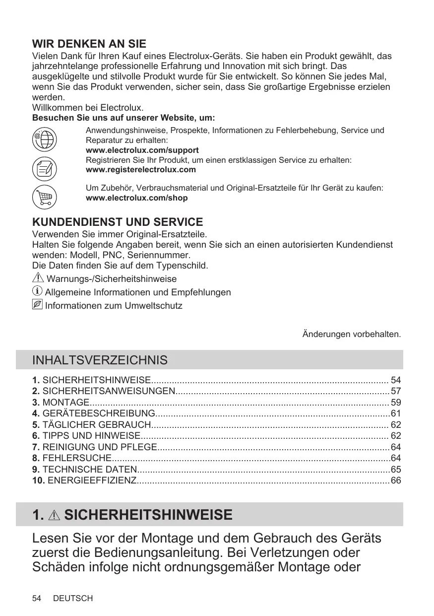 Vielen Dank für Ihren Kauf eines Electrolux-Geräts. Sie haben ein Produkt gewählt, das jahrzehntelange professionelle Erfahrung und Innovation mit sich bringt. Das ausgeklügelte und stilvolle Produkt wurde für Sie entwickelt. So können Sie jedes Mal, wenn Sie das Produkt verwenden, sicher sein, dass Sie großartige Ergebnisse erzielen werden. Willkommen bei Electrolux. Besuchen Sie uns auf unserer Website, um: Anwendungshinweise, Prospekte, Informationen zu Fehlerbehebung, Service und Reparatur zu erhalten: www.electrolux.com/support Registrieren Sie Ihr Produkt, um einen erstklassigen Service zu erhalten: www.registerelectrolux.com Um Zubehör, Verbrauchsmaterial und Original-Ersatzteile für Ihr Gerät zu kaufen: www.electrolux.com/shop