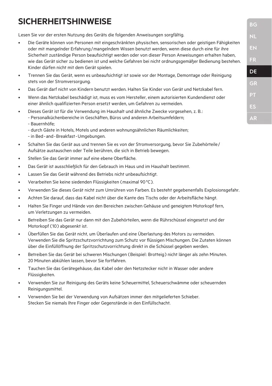 CAUSE POSSIBLE L’appareil vibre / bouge pendant son fonctionnement. Éclaboussures. Ingrédients ou farine se collent au fond ou sur le côté du bol et ne sont pas correctement mélangés. SICHERHEITSHINWEISE Lesen Sie vor der ersten Nutzung des Geräts die folgenden Anweisungen sorgfältig. Die Geräte können von Personen mit eingeschränkten physischen, sensorischen oder geistigen Fähigkeiten oder mit mangelnder Erfahrung/ mangelndem Wissen benutzt werden, wenn diese durch eine für ihre Sicherheit zuständige Person beaufsichtigt werden oder von dieser Person Anweisungen erhalten haben, wie das Gerät sicher zu bedienen ist und welche Gefahren bei nicht ordnungsgemäßer Bedienung bestehen. Kinder dürfen nicht mit dem Gerät spielen.