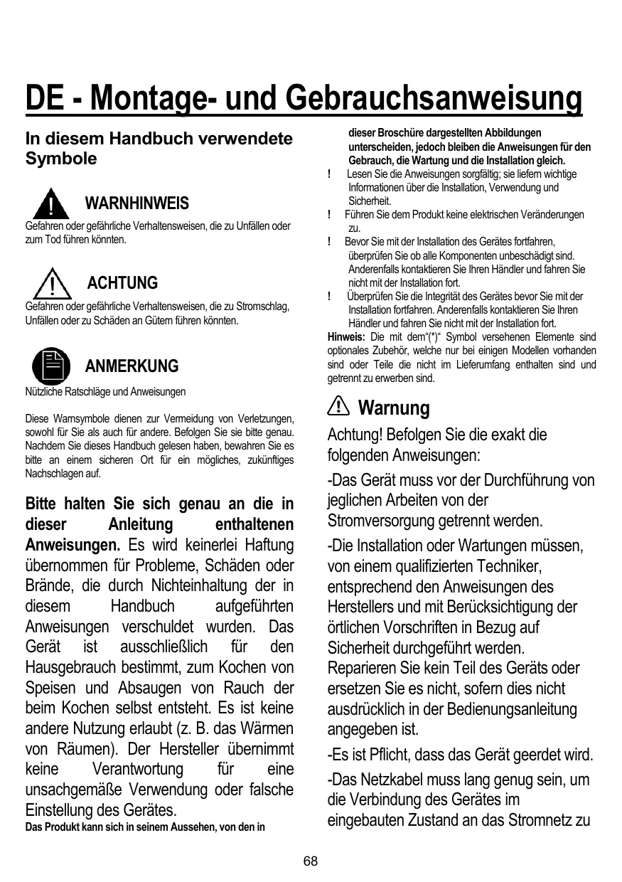 Bitte halten Sie sich genau an die in dieser Anleitung enthaltenen Anweisungen. Es wird keinerlei Haftung übernommen für Probleme, Schäden oder Brände, die durch Nichteinhaltung der in diesem Handbuch aufgeführten Anweisungen verschuldet wurden. Das Gerät ist ausschließlich für den Hausgebrauch bestimmt, zum Kochen von Speisen und Absaugen von Rauch der beim Kochen selbst entsteht. Es ist keine andere Nutzung erlaubt (z. B. das Wärmen von Räumen). Der Hersteller übernimmt keine Verantwortung für eine unsachgemäße Verwendung oder falsche Einstellung des Gerätes. Das Produkt kann sich in seinem Aussehen, von den in