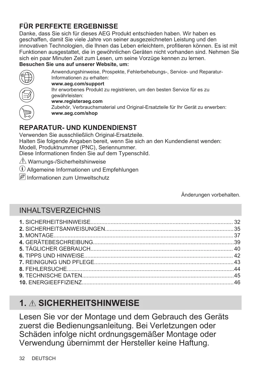 Danke, dass Sie sich für dieses AEG Produkt entschieden haben. Wir haben es geschaffen, damit Sie viele Jahre von seiner ausgezeichneten Leistung und den innovativen Technologien, die Ihnen das Leben erleichtern, profitieren können. Es ist mit Funktionen ausgestattet, die in gewöhnlichen Geräten nicht vorhanden sind. Nehmen Sie sich ein paar Minuten Zeit zum Lesen, um seine Vorzüge kennen zu lernen. Besuchen Sie uns auf unserer Website, um: Anwendungshinweise, Prospekte, Fehlerbehebungs-, Service- und ReparaturInformationen zu erhalten: www.aeg.com/support Ihr erworbenes Produkt zu registrieren, um den besten Service für es zu gewährleisten: www.registeraeg.com Zubehör, Verbrauchsmaterial und Original-Ersatzteile für Ihr Gerät zu erwerben: www.aeg.com/shop