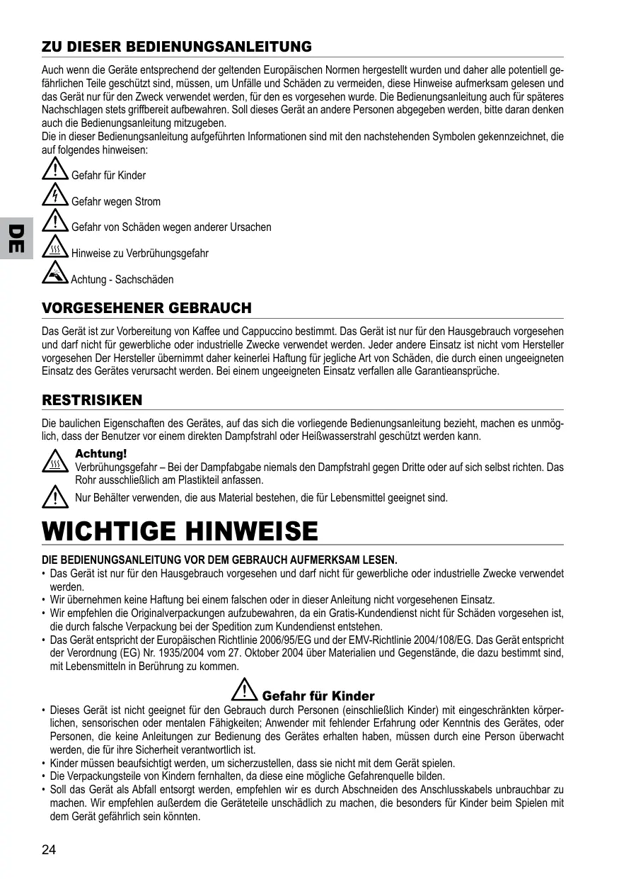 Gefahr von Schäden wegen anderer Ursachen Hinweise zu Verbrühungsgefahr Achtung - Sachschäden Vorgesehener Gebrauch Das Gerät ist zur Vorbereitung von Kaffee und Cappuccino bestimmt. Das Gerät ist nur für den Hausgebrauch vorgesehen und darf nicht für gewerbliche oder industrielle Zwecke verwendet werden. Jeder andere Einsatz ist nicht vom Hersteller vorgesehen Der Hersteller übernimmt daher keinerlei Haftung für jegliche Art von Schäden, die durch einen ungeeigneten Einsatz des Gerätes verursacht werden. Bei einem ungeeigneten Einsatz verfallen alle Garantieansprüche. Restrisiken Die baulichen Eigenschaften des Gerätes, auf das sich die vorliegende Bedienungsanleitung bezieht, machen es unmöglich, dass der Benutzer vor einem direkten Dampfstrahl oder Heißwasserstrahl geschützt werden kann. Achtung! Verbrühungsgefahr – Bei der Dampfabgabe niemals den Dampfstrahl gegen Dritte oder auf sich selbst richten. Das Rohr ausschließlich am Plastikteil anfassen. Nur Behälter verwenden, die aus Material bestehen, die für Lebensmittel geeignet sind. Wichtige Hinweise Die Bedienungsanleitung vor dem Gebrauch aufmerksam lesen.