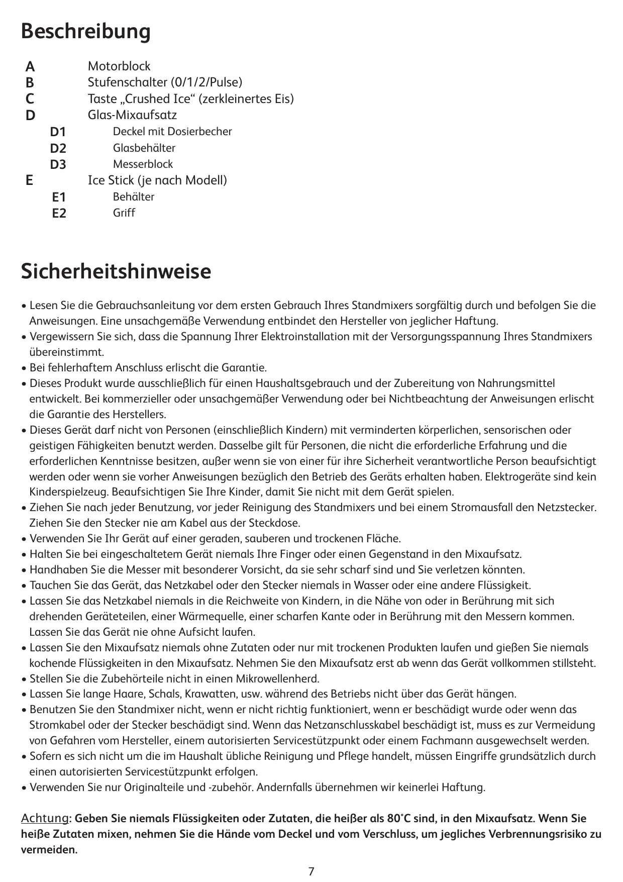 A B C D E Motorblock Stufenschalter (0/1/2/Pulse) Taste „Crushed Ice“ (zerkleinertes Eis) Glas-Mixaufsatz D1 D2 D3
