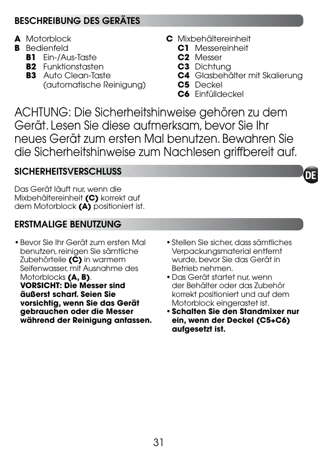 ERSTMALIGE BENUTZUNG • Stellen Sie sicher, dass sämtliches Verpackungsmaterial entfernt wurde, bevor Sie das Gerät in Betrieb nehmen. • Das Gerät startet nur, wenn der Behälter oder das Zubehör korrekt positioniert und auf dem Motorblock eingerastet ist. • Schalten Sie den Standmixer nur ein, wenn der Deckel (C5+C6) aufgesetzt ist.