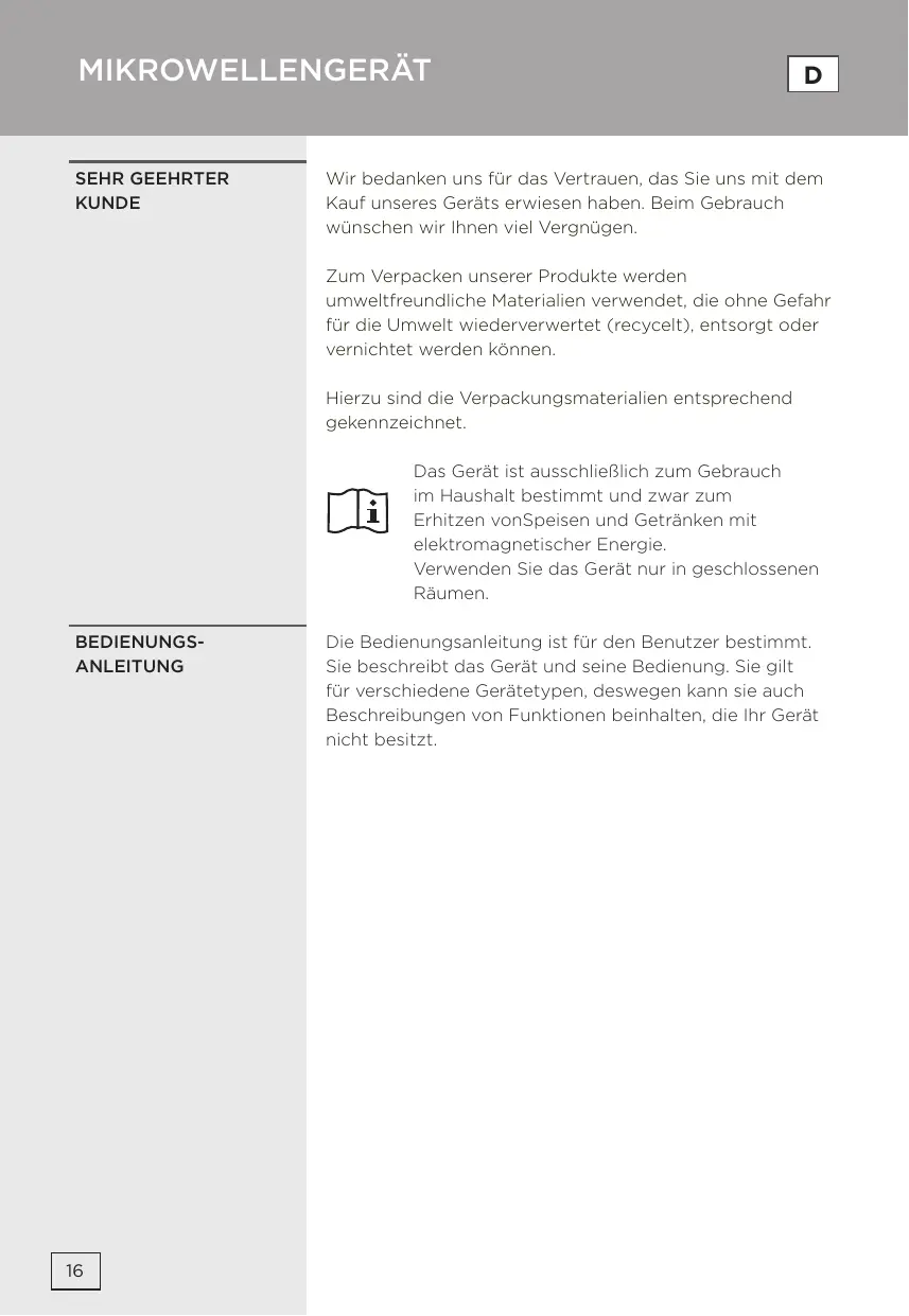 Wir bedanken uns für das Vertrauen, das Sie uns mit dem Kauf unseres Geräts erwiesen haben. Beim Gebrauch wünschen wir Ihnen viel Vergnügen. Zum Verpacken unserer Produkte werden umweltfreundliche Materialien verwendet, die ohne Gefahr für die Umwelt wiederverwertet (recycelt), entsorgt oder vernichtet werden können. Hierzu sind die Verpackungsmaterialien entsprechend gekennzeichnet. Das Gerät ist ausschließlich zum Gebrauch im Haushalt bestimmt und zwar zum Erhitzen vonSpeisen und Getränken mit elektromagnetischer Energie. Verwenden Sie das Gerät nur in geschlossenen Räumen. BEDIENUNGSANLEITUNG