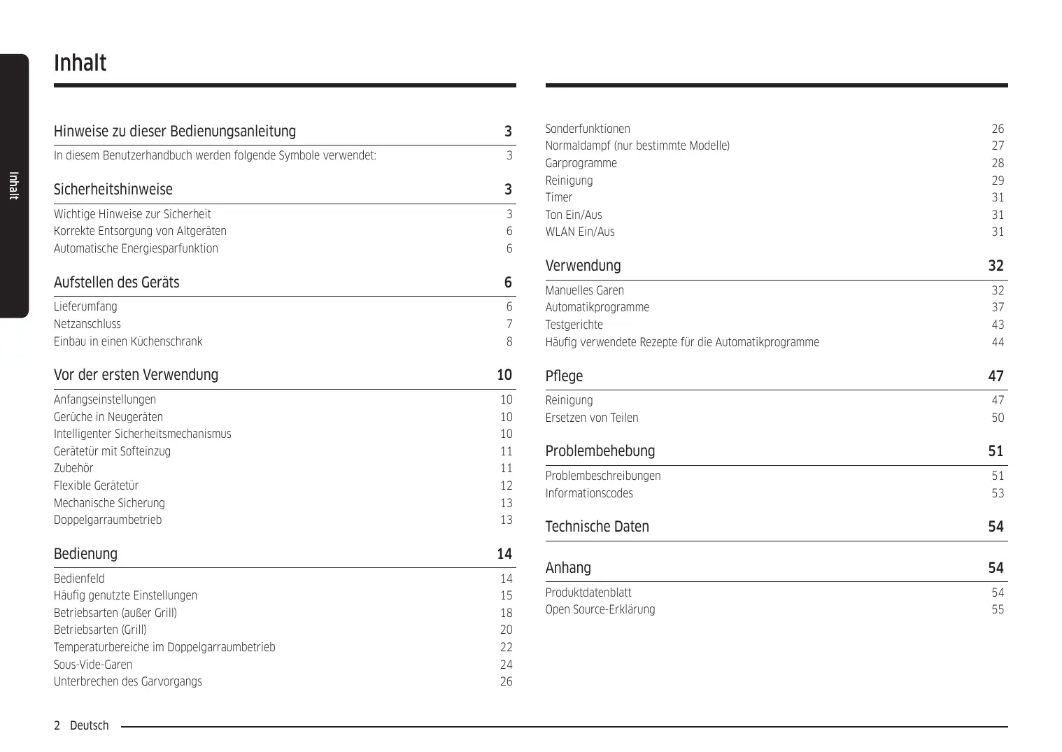 Sonderfunktionen Normaldampf (nur bestimmte Modelle) Garprogramme Reinigung Timer Ton Ein/Aus WLAN Ein/Aus Verwendung Manuelles Garen Automatikprogramme Testgerichte Häufig verwendete Rezepte für die Automatikprogramme Pflege Reinigung Ersetzen von Teilen