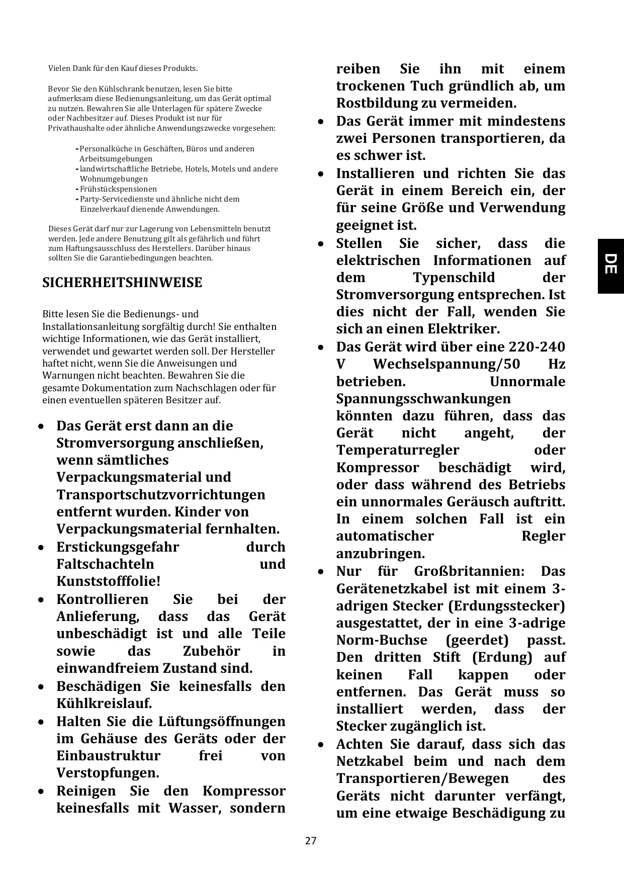 Cet appareil doit être utilisé uniquement pour conserver de la nourriture ; tout autre usage est considéré comme dangereux et le fabricant ne sera pas tenu responsable en cas de mauvaise utilisation. Il est donc recommandé de prendre connaissance des conditions de garantie.