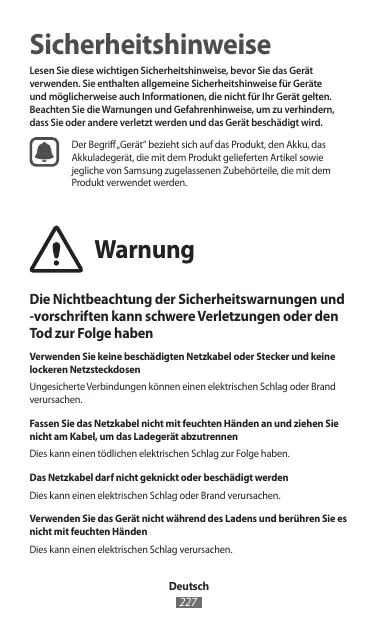 Le non-respect des consignes de sécurité peut entraîner des blessures graves, voire la mort N’utilisez pas de prises et de cordons d’alimentation endommagé(e)s ou de prises électriques mal fixées Les branchements non sécurisés engendrent un risque d’électrocution ou d’incendie. Ne touchez pas le cordon d’alimentation avec les mains mouillées et ne déconnectez pas le chargeur en tirant sur le cordon Vous risquez de vous électrocuter. Ne tordez et n’endommagez pas le cordon d’alimentation Vous risquez de vous électrocuter ou de provoquer un incendie. N’utilisez pas l’appareil avec les mains mouillées ou lorsque celui-ci est en cours de chargement Vous risquez de vous électrocuter.