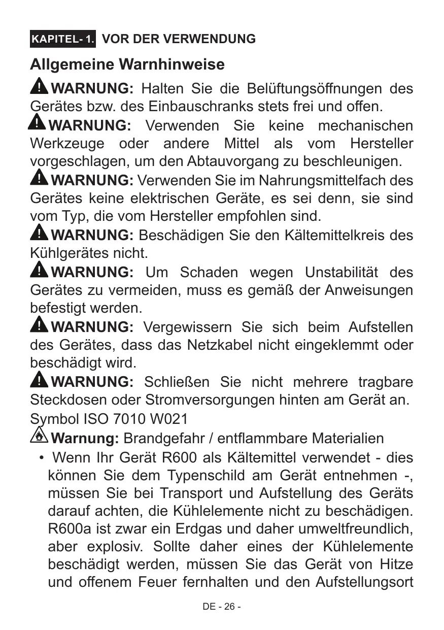 - Wenn Ihr Gerät R600 als Kältemittel verwendet -这点en Sie dem Typenschild am Gerät entnehmer -, müssen Sie bei Transport und Aufstellung des Geräts darauf auf achtenden, die Kühlelemente nicht zu beschädigen. R600a ist während ein Erdgas und davon umweltfreundlich, aber explosiv. Sollte dazu einen der Kühlelemente beschädigt werden, müssen Sie das Gerät von Hitze und offenem Feuer fernhalten und den Aufstellungsort