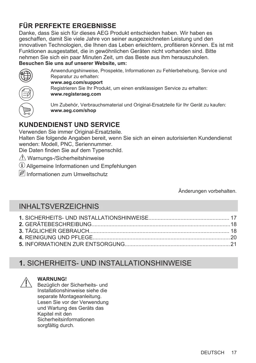 2 Obtenir des conseils d’utilisation, des brochures, un dépanneur, des informations sur le service et les réparations : www.aeg.com/support Enregistrer votre produit pour un meilleur service : www.registeraeg.com Acheter des accessoires, consommables et pièces de rechange d’origine pour votre appareil : www.aeg.com/shop