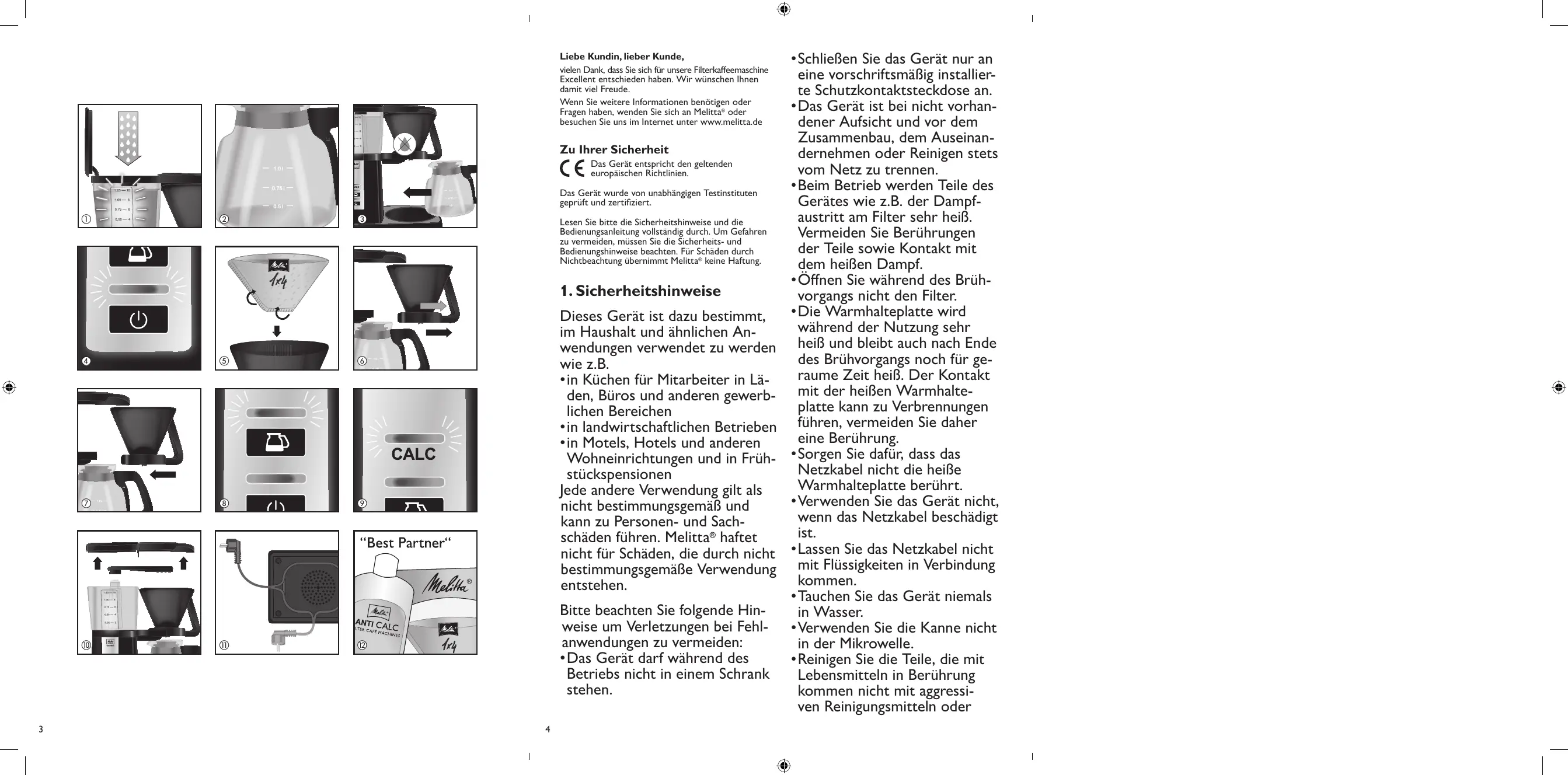 Liebe Kundin, lieber Kunde, vielen Dank, dass Sie sich für unsere Filterkaffeemaschine Excellent entschieden haben. Wir wünschen Ihnen damit viel Freude. Wenn Sie weitere Informationen benötigen oder Fragen haben, wenden Sie sich an Melitta® oder besuchen Sie uns im Internet unter www.melitta.de Zu Ihrer Sicherheit Das Gerät entspricht den geltenden europäischen Richtlinien. Das Gerät wurde von unabhängigen Testinstituten geprüft und zertifiziert.