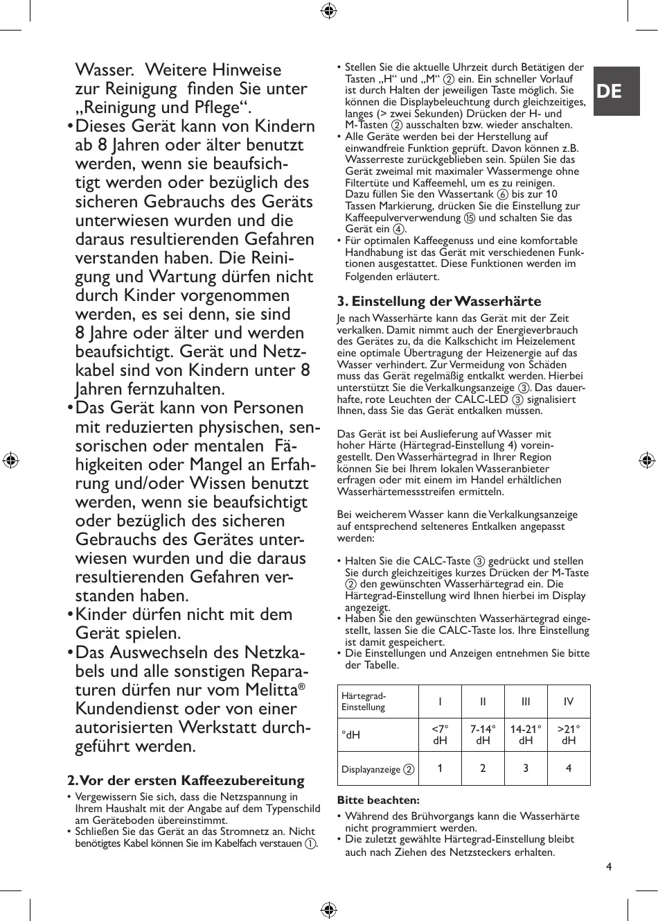 Wasser. Weitere Hinweise zur Reinigung finden Sie unter „Reinigung und Pflege“. • Dieses Gerät kann von Kindern ab 8 Jahren oder älter benutzt werden, wenn sie beaufsichtigt werden oder bezüglich des sicheren Gebrauchs des Geräts unterwiesen wurden und die daraus resultierenden Gefahren verstanden haben. Die Reinigung und Wartung dürfen nicht durch Kinder vorgenommen werden, es sei denn, sie sind 8 Jahre oder älter und werden beaufsichtigt. Gerät und Netzkabel sind von Kindern unter 8 Jahren fernzuhalten. • Das Gerät kann von Personen mit reduzierten physischen, sensorischen oder mentalen Fähigkeiten oder Mangel an Erfahrung und/oder Wissen benutzt werden, wenn sie beaufsichtigt oder bezüglich des sicheren Gebrauchs des Gerätes unterwiesen wurden und die daraus resultierenden Gefahren verstanden haben. • Kinder dürfen nicht mit dem Gerät spielen. • Das Auswechseln des Netzkabels und alle sonstigen Reparaturen dürfen nur vom Melitta® Kundendienst oder von einer autorisierten Werkstatt durchgeführt werden. 2.Vor der ersten Kaffeezubereitung • Vergewissern Sie sich, dass die Netzspannung in Ihrem Haushalt mit der Angabe auf dem Typenschild am Geräteboden übereinstimmt. • Schließen Sie das Gerät an das Stromnetz an. Nicht benötigtes Kabel können Sie im Kabelfach verstauen .