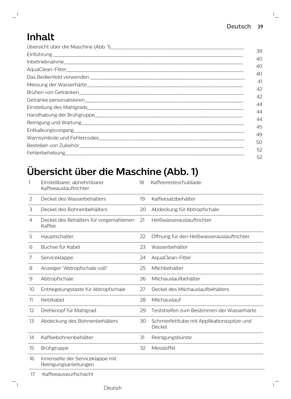 Problem Ursache Lösung Die Milch schäumt nicht auf. Die Milchkanne ist verschmutzt oder nicht richtig eingesetzt. Reinigen Sie die Kanne und achten Sie darauf, dass sie beim Einsetzen richtig positioniert ist. Der Milchauslauf wurde nicht ganz geöffnet. Stellen Sie sicher, dass sich der Milchauslauf in der richtigen Position befindet. Die Milchkanne ist unvollständig zusammengesetzt. Stellen Sie sicher, dass alle Teile (besonders der Milchschlauch) richtig zusammengesetzt sind. Die verwendete Milchsorte eignet sich nicht zum Aufschäumen. Die Menge und die Qualität des erzielbaren Milchschaums variieren je nach der verwendeten Milchsorte. Wir haben die folgenden Milcharten getestet und sie lassen sich gut aufschäumen: fettarme Milch oder Vollmilch von der Kuh, Sojamilch und laktosefreie Milch. Andere Milcharten wurden nicht getestet und ergeben eventuell weniger Schaum. Die Milch spritzt. Die verwendete Milch ist nicht kalt genug. Achten Sie darauf, dass Sie kalte Milch direkt aus dem Kühlschrank verwenden. Die Maschine scheint undicht zu sein. Die Maschine spült den internen Kreislauf und die Brühgruppe mit Wasser. Ein Teil des Wassers fließt durch das interne System direkt in die Tropfschale. Das ist normal. Leeren Sie die Tropfschale, wenn die Anzeige „Tropfschale voll“ durch die Abdeckung (Abb. 19) der Tropfschale zu sehen ist. Stellen Sie eine Tasse unter den Heißwasserauslauf, um das Spülwasser aufzufangen. Die Tropfschale ist voll und läuft über, so dass es danach aussieht, als ob die Maschine undicht ist. Leeren Sie die Tropfschale, wenn die Anzeige „Tropfschale voll“ durch die Abdeckung (Abb. 19) der Tropfschale zu sehen ist. Stellen Sie eine Tasse unter den Heißwasserauslauf, um das Spülwasser aufzufangen. Die Maschine steht nicht auf einer gerade Oberfläche. Setzen Sie das Gerät auf eine gerade Oberfläche, damit die Anzeige "drip tray full" (Tropfschale voll) normal funktioniert. Der Filter wurde nicht rechtzeitig ausgetauscht, nachdem das AquaCleanWasserfilter-Symbol geblinkt hat und die Kapazität auf 0 % gesunken ist. Entkalken Sie das Gerät zuerst, und bauen Sie dann den AquaClean-Filter ein. Ich kann den AquaClean-Filter nicht aktivieren und das Gerät will entkalkt werden.