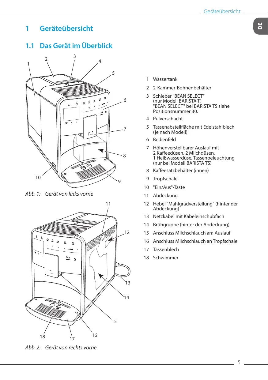 3 Schieber "BEAN SELECT" (nur Modell BARISTA T) "BEAN SELECT" bei BARISTA TS siehe Positionsnummer 30. 4 Pulverschacht 5 Tassenabstellfläche mit Edelstahlblech (je nach Modell) 6 Bedienfeld 7 Höhenverstellbarer Auslauf mit 2 Kaffeedüsen, 2 Milchdüsen, 1 Heißwasserdüse, Tassenbeleuchtung (nur bei Modell BARISTA TS) 8 Kaffeesatzbehälter (innen) 9 Tropfschale