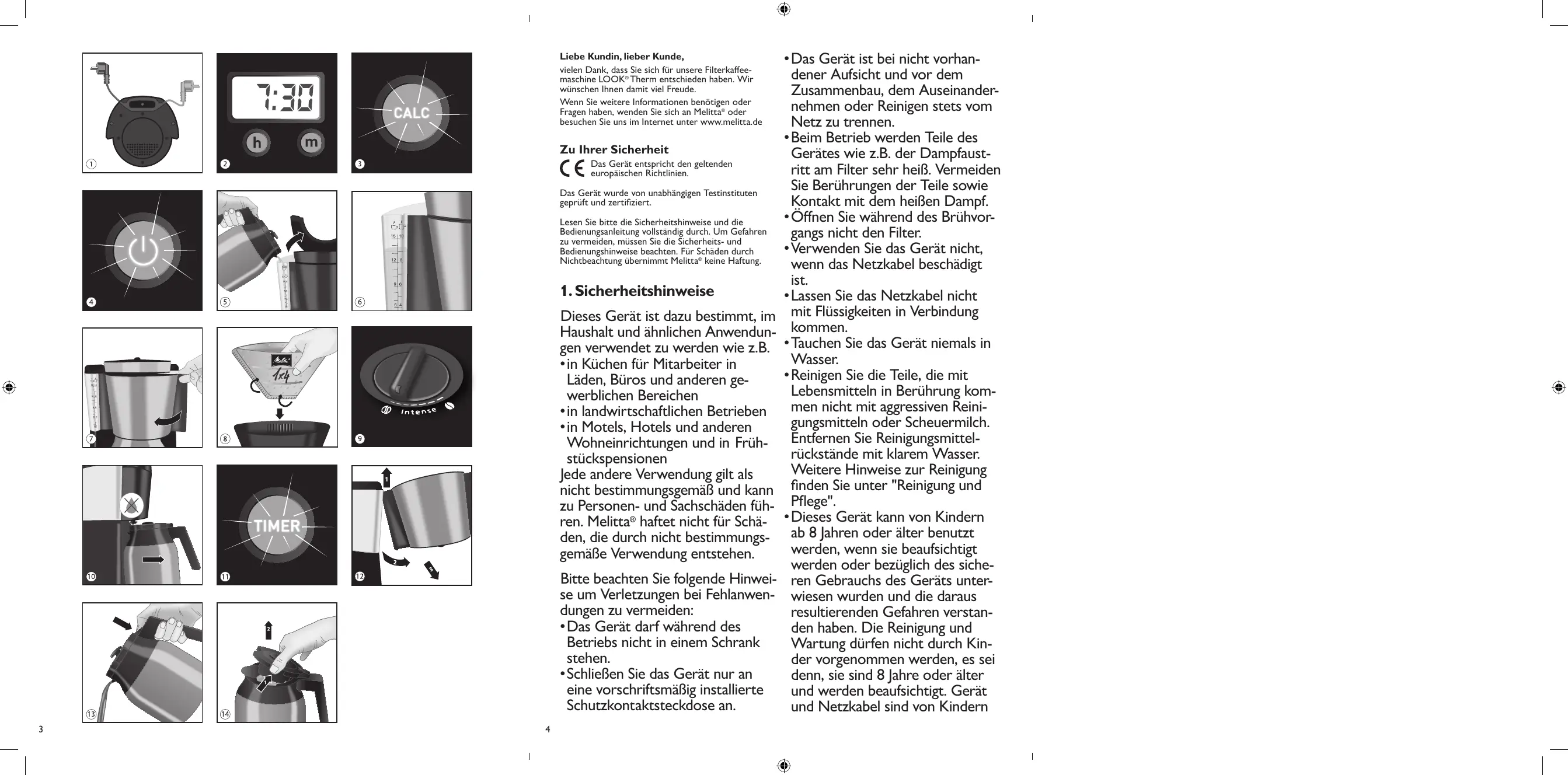 in keiner äußeren Abmessung größer als 25 Zentimeter sind, im Einzelhandelsgeschäft oder in unmittelbarer Nähe hierzu unentgeltlich zurückzunehmen; die Rücknahme darf nicht an den Kauf eines Elektro- oder Elektronikgerätes geknüpft werden und ist auf drei Altgeräte pro Geräteart beschränkt. Weiterhin können Sie Altgeräte bei öffentlichrechtlichen Entsorgungsträgern sowie zertifizierten Erstbehandlungsanlagen abgeben. Vor der Entsorgung setzen Sie die Altgeräte ggfs. auf den Werkszustand zurück um ggfs. vorhandene personenbezogene Daten (wie z. B. Name der Nutzerprofile bei Vollautomaten) zu löschen. Das Symbol „durchgestrichene Mülltonne auf Rädern“ auf dem Typenschild bedeutet, dass Elektrogeräte getrennt erfasst werden müssen. Dear customer, Thank you for buying our LOOK® Therm filter coffee maker. We hope you will be very happy with it. If you need further information or if you have any questions please contact Melitta® or visit us on the Internet at www.melitta.co.uk For your safety The appliance complies with all valid European guidelines.