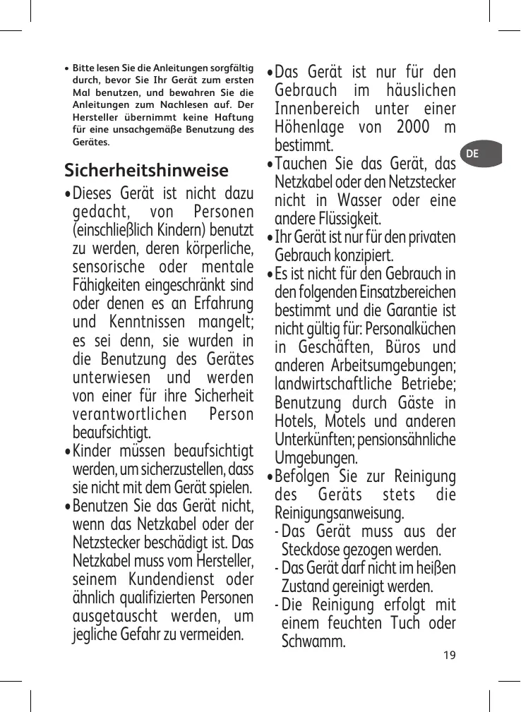 • Das Gerät ist nur für den Gebrauch im häuslichen Innenbereich unter einer Höhenlage von 2000 m bestimmt. • Tauchen Sie das Gerät, das Netzkabel oder den Netzstecker nicht in Wasser oder eine andere Flüssigkeit. • Ihr Gerät ist nur für den privaten Gebrauch konzipiert. • Es ist nicht für den Gebrauch in den folgenden Einsatzbereichen bestimmt und die Garantie ist nicht gültig für: Personalküchen in Geschäften, Büros und anderen Arbeitsumgebungen; landwirtschaftliche Betriebe; Benutzung durch Gäste in Hotels, Motels und anderen Unterkünften; pensionsähnliche Umgebungen. • Befolgen Sie zur Reinigung des Geräts stets die Reinigungsanweisung. - Das Gerät muss aus der Steckdose gezogen werden. - Das Gerät darf nicht im heißen Zustand gereinigt werden. - Die Reinigung erfolgt mit einem feuchten Tuch oder Schwamm. 19