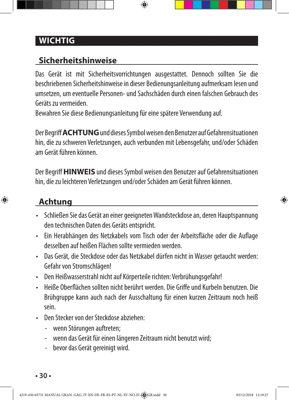 • Brancher la machine à une prise murale appropriée, dont la tension principale correspond aux données techniques de l'appareil. • Le câble d'alimentation ne doit pas pendre de la table ou du plan de travail et ne doit pas être en contact avec des surfaces chaudes. • Ne pas immerger la machine, la prise de courant ou le câble d'alimentation dans l'eau : danger de choc électrique ! • Ne jamais diriger le jet d’eau chaude vers des parties du corps : danger de brûlures ! • Ne pas toucher les surfaces chaudes. Utiliser les poignées et les boutons. Après l'arrêt de la machine, le groupe de distribution du café peut demeurer chaud pendant une courte période. • Débrancher la fiche de la prise murale : - en cas d'anomalies ; - si la machine reste inactive pendant une longue période ; - avant de procéder au nettoyage de la machine. • 42 • 4219-450-03731 MANUAL GRAN. GAG. IT-EN-DE-FR-ES-PT-NL-SV-NO-FI-DA-GR.indd 42