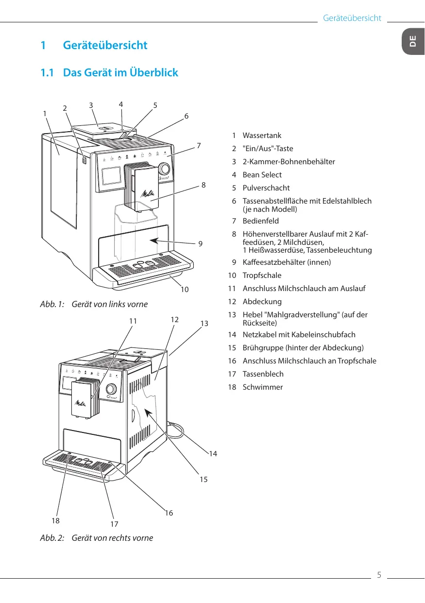 2 "Ein/Aus"-Taste 3 2-Kammer-Bohnenbehälter 4 Bean Select 8