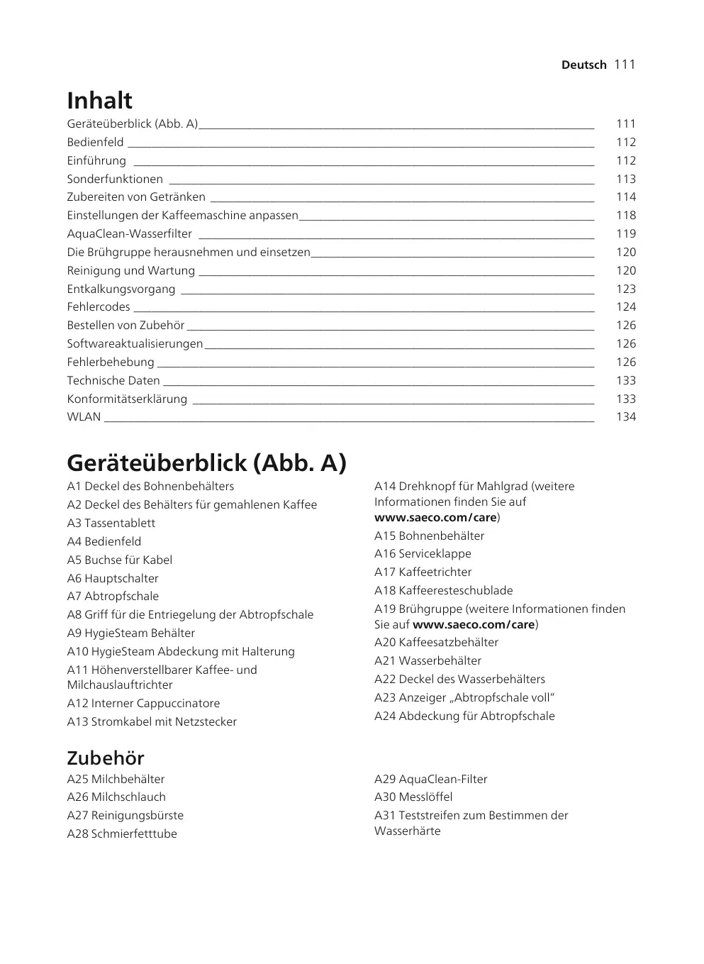 Einführung Herzlichen Glückwunsch zum Kauf eines Saeco Kaffeevollautomaten! Um den Online-Support von Saeco in vollem Umfang nutzen zu können, registrieren Sie Ihr Gerät mit der integrierten WLAN-Verbindung über das Bedienfeld oder gehen Sie auf www.saeco.com/MyCoffeeMachine und registrieren Sie dort Ihr Produkt. Lesen Sie die separate Sicherheitsbroschüre vor dem ersten Gebrauch des Gerät aufmerksam durch, und bewahren Sie sie für eine spätere Verwendung auf. Ihr Saeco-Kaffeevollautomat kann mit Ihrem WLAN-Netzwerk verbunden werden, um Ihr Kaffeeerlebnis zu verbessern. Wenn Sie Ihr Gerät mit Ihrem WLAN-Netzwerk verbinden, werden folgende Funktionen verfügbar: - personalisierte Empfehlungen auf Basis maschinellen Lernens - regelmäßige Software-Updates, die Ihre Benutzererfahrung verbessern - Nutzen Sie die Shop-Funktionen, sofern in Ihrem Land verfügbar. - Wenn diese Option in Ihrem Land verfügbar ist, können Sie Ihre Kaffeemaschine mit Ihrem AmazonKonto verknüpfen, um Zubehör nachzubestellen - Verbindung mit Ihrem Alexa-Heimgerät, um die Sprachsteuerung zu nutzen, soweit in Ihrem Land verfügbar Hinweis: Die Maschine wurde mit Kaffee getestet. Zwar wurde die Maschine anschließend sorgfältig gereinigt, aber es ist möglich, dass noch ein Rest Kaffee in der Maschine ist. Wir garantieren aber, dass Ihre Maschine absolut neu ist.