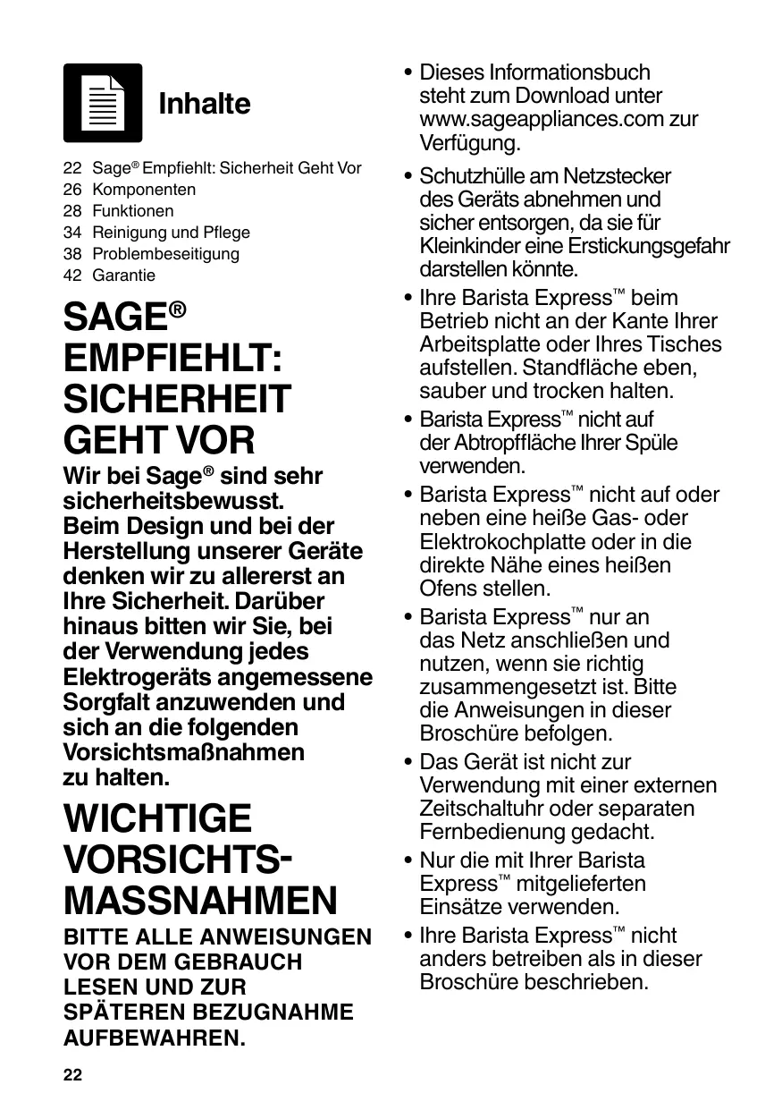 - Dieses Informationsbuch steht zum Download unter www.sageappliances.com zur Verfügung.