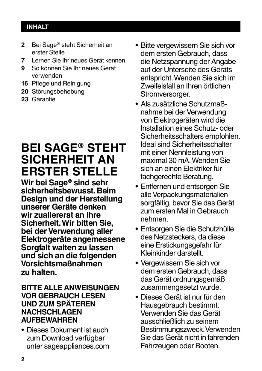 KURZANLEITUNG PAGE HEADER..... INHALT Bei Sage® steht Sicherheit an erster Stelle 7 Lernen Sie Ihr neues Gerät kennen 9 So können Sie Ihr neues Gerät verwenden 16 Pflege und Reinigung 20 Störungsbehebung 23 Garantie