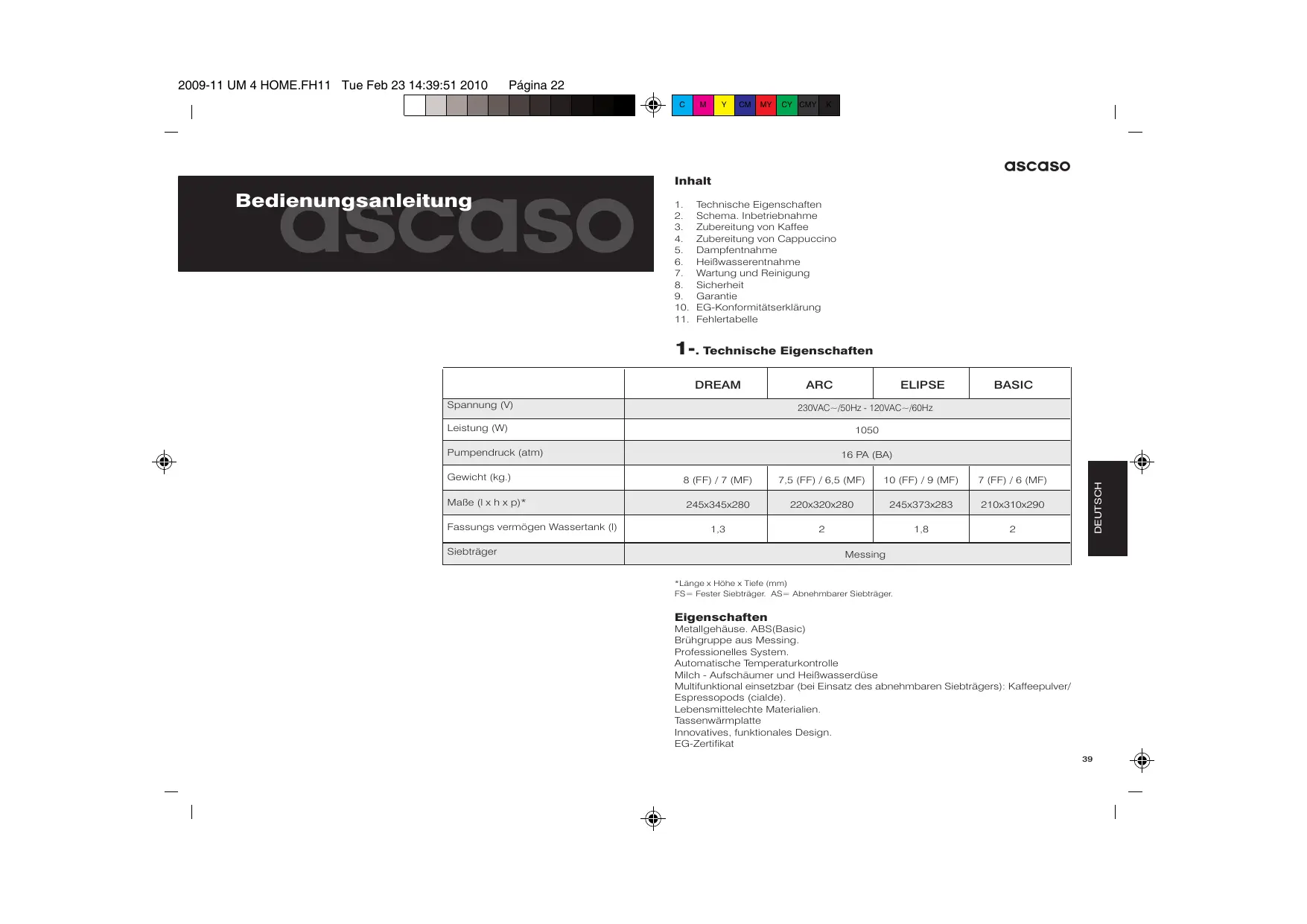 Konformitätserklärung ASCASO FACTORY SL erklärt, dass das in der vorliegenden Erklärung bezeichnete ErzeugnisEspressomaschine die Anforderungen der Richtlinie vom 14. Juni 1989 über die Angleichung der Rechtsvorschriften der Mitgliedsstaaten für Maschinen (89/392/EWG), elektrische Betriebsmittel (73/23/EWG) und elektromagnetische Verträglichkeit (89/396/EWG)erfüllt. DEUTSCH 2009-11 UM 4 HOME.FH11 Tue Feb 23 14:39:51 2010