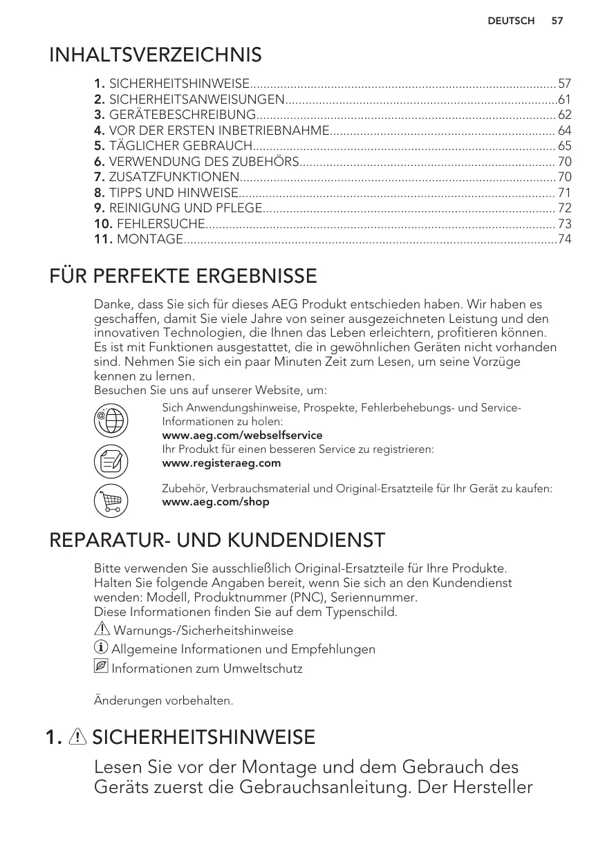 INHALTSVERZEICHNIS 1. SICHERHEITSHINWEISE 57 2. SICHERHEITSANWEISUNGEN61 3. GERÄTEBESCHREIBUNG 62 4. VOR DER ERSTEN INBETRIEBNAHME 64 5. TÄGLICHER GEBRAUCH 65 6. VERWENDUNG DES ZUBEHÖRS 70 7. ZUSATZFUNKTIONEN 70 8. TIPPS UND HINWEISE 71 9. REINIGUNG UND PFLEGE 72 10. FEHLERSUCHE 73 11. MONTAGE74