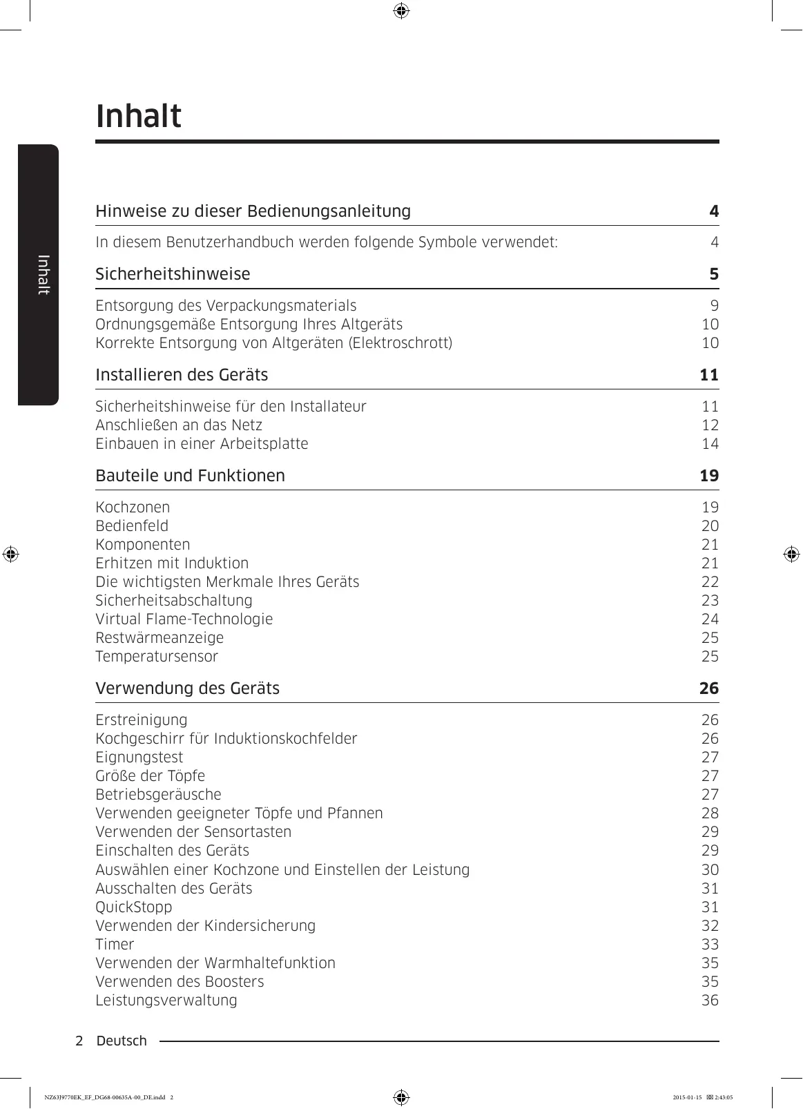 www.samsung.com/ie/support DG68-00635A-00 NZ63J9770EK_EF_DG68-00635A-00_NL.indd 48 2015-01-15 2:44:01 Induktionskochfeld Benutzerhandbuch NZ63J9770EK NZ63J9770EK_EF_DG68-00635A-00_DE.indd 1 2015-01-15 2:43:05 Inhalt Inhalt Hinweise zu dieser Bedienungsanleitung