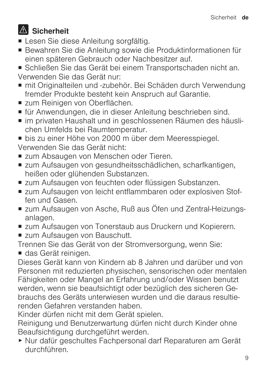 ¡ Read this instruction manual carefully. ¡ Keep the instruction manual and the product information safe for future reference or for the next owner. ¡ avec des pièces et accessoires d’origine. En cas de dommages dus à l’utilisation de produits tiers, le droit à la garantie expire. ¡ pour nettoyer les surfaces. ¡ pour les utilisations décrites dans cette notice. ¡ pour un usage domestique privé et dans les pièces fermées d’un domicile, à la température ambiante. ¡ jusqu'à une altitude maximale de 2000 m au-dessus du niveau de la mer. N’utilisez pas l’appareil : ¡ pour l’aspiration de personnes et d’animaux. ¡ pour l’aspiration de substances nocives pour la santé, aux arêtes vives, chaudes ou brûlantes. ¡ pour l’aspiration de substances humides ou liquides. ¡ pour l’aspiration de substances et gaz légèrement inflammables ou explosibles. ¡ pour l’aspiration de cendres, de la suie de four et d’installations de chauffage central. ¡ pour l’aspiration de poussières de toner des imprimantes et copieurs. ¡ pour l’aspiration de débris de construction. Débranchez l’appareil du secteur lorsque : ¡ vous nettoyez l’appareil. Les enfants de 8 ans et plus, les personnes souffrant d’un handicap physique, sensoriel ou mental ou ne détenant pas l’expérience et/ou les connaissances nécessaires pourront utiliser cet appareil à condition de le faire sous surveillance, ou que son utilisation sûre leur ait été enseignée et qu’ils aient compris les dangers qui en émanent. Les enfants ne sont pas autorisés à jouer avec l'appareil. 17