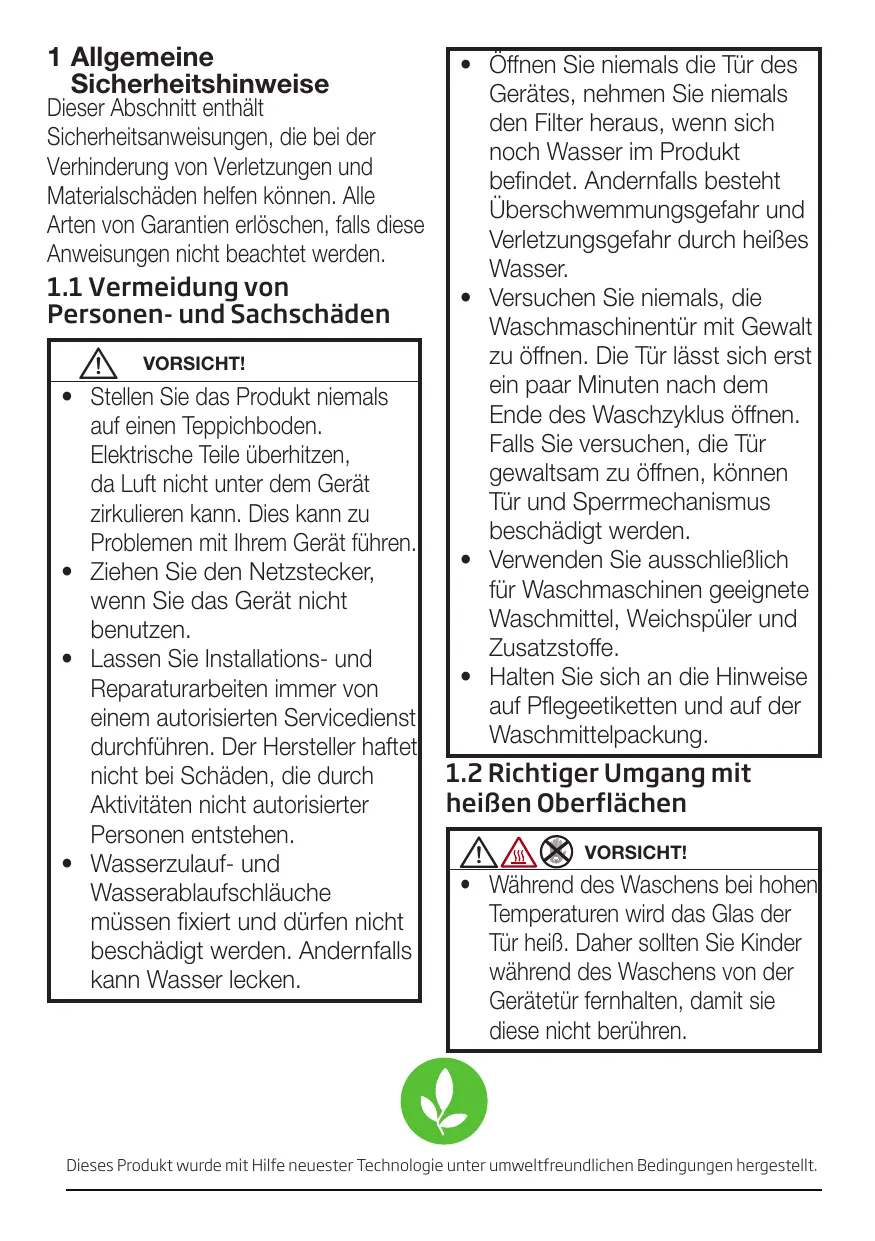 - Während des Waschens bei hohen Temperaturen wird das Glas der Tür heiß. Daher sollten Sie Kinder während des Waschens von der Gerätetür fernhalten, damit sie diese nicht berühren. Dieses Produkt wurde mit Hilfe neuester Technologie unter umweltfreundlichen Bedingungen hergestellt.