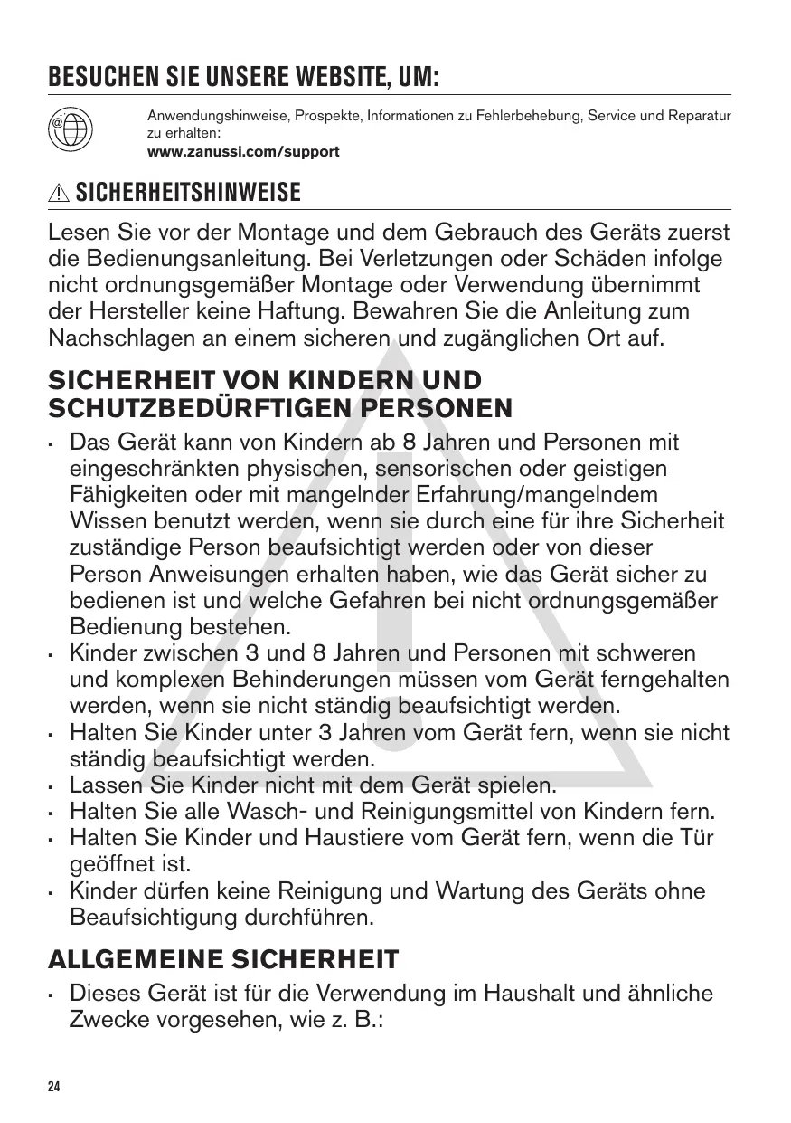BESUCHEN SIE UNSERE WEBSITE, UM: Anwendungshinweise, Prospekte, Informationen zu Fehlerbehebung, Service und Reparatur zu erhalten: www.zanussi.com/support