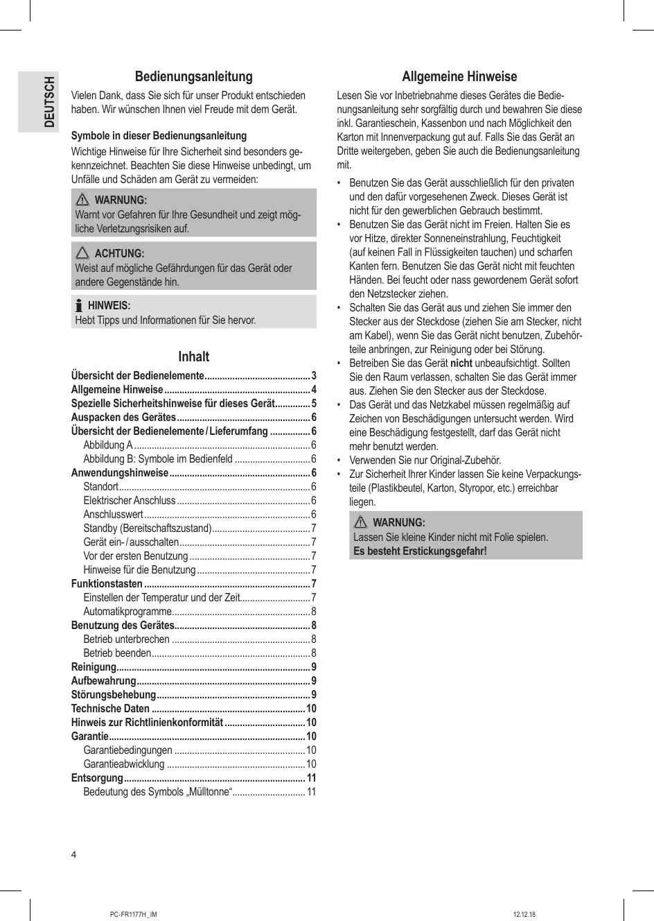 Inhalt Übersicht der Bedienelemente3 Allgemeine Hinweise4 Spezielle Sicherheitshinweise für dieses Gerät5 Auspacken des Gerätes6 Übersicht der Bedienelemente / Lieferumfang6 Abbildung A6 Abbildung B: Symbole im Bedienfeld6 Anwendungshinweise6 Standort6 Elektrischer Anschluss6 Anschlusswert6 Standby (Bereitschaftszustand)7 Gerät ein- / ausschalten7 Vor der ersten Benutzung7 Hinweise für die Benutzung7 Funktionstasten7 Einstellen der Temperatur und der Zeit7 Automatikprogramme8 Benutzung des Gerätes8 Betrieb unterbrechen8 Betrieb beenden8 Reinigung9 Aufbewahrung9 Störungsbehebung9 Technische Daten10 Hinweis zur Richtlinienkonformität10 Garantie10 Garantiebedingungen10 Garantieabwicklung10 Entsorgung 11 Bedeutung des Symbols „Mülltonne“ 11