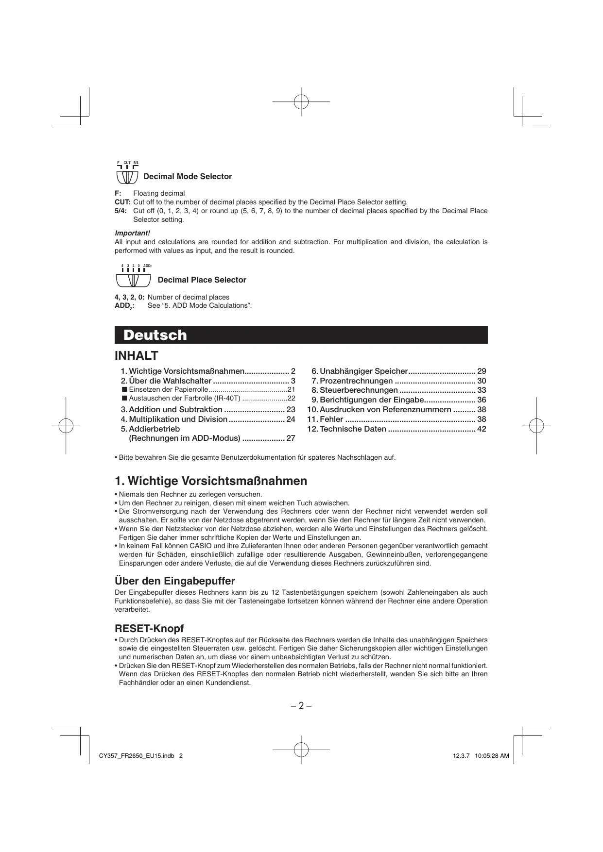 CUT 5/4 Decimal Mode Selector Floating decimal CUT: Cut off to the number of decimal places specified by the Decimal Place Selector setting. 5/4: Cut off (0, 1, 2, 3, 4) or round up (5, 6, 7, 8, 9) to the number of decimal places specified by the Decimal Place Selector setting. Important! All input and calculations are rounded for addition and subtraction. For multiplication and division, the calculation is performed with values as input, and the result is rounded. 4 3 2 0 ADD2 Decimal Place Selector 4, 3, 2, 0: Number of decimal places See “5. ADD Mode Calculations”. ADD2: Deutsch INHALT
