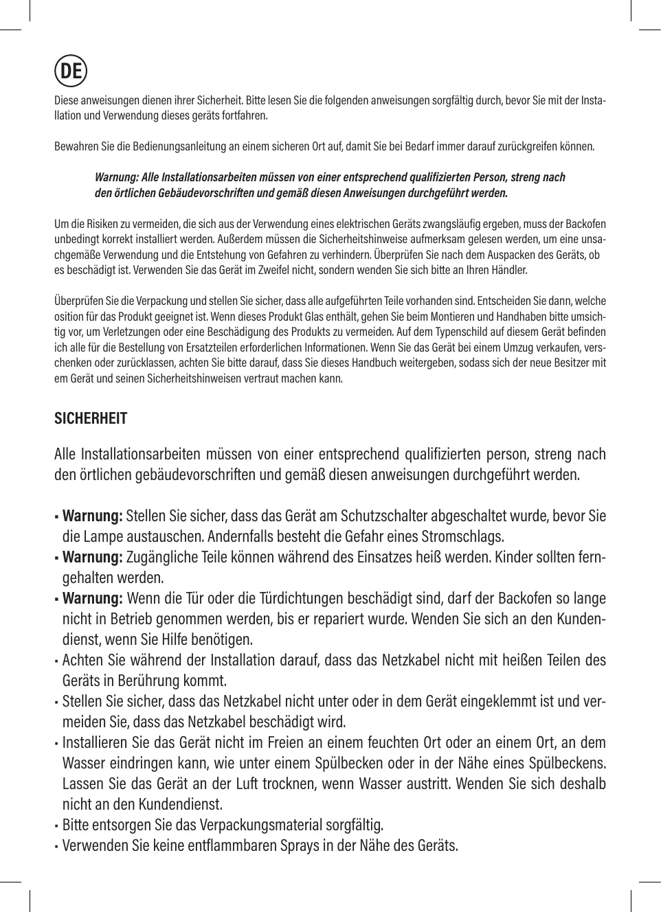 DE Diese anweisungen dienen ihrer Sicherheit. Bitte lesen Sie die folgenden anweisungen sorgfältig durch, bevor Sie mit der Installation und Verwendung dieses geräts fortfahren. Bewahren Sie die Bedienungsanleitung an einem sicheren Ort auf, damit Sie bei Bedarf immer darauf zurückgreifen können. Warnung: Alle Installationsarbeiten müssen von einer entsprechend qualifizierten Person, streng nach den örtlichen Gebäudevorschriften und gemäß diesen Anweisungen durchgeführt werden. Um die Risiken zu vermeiden, die sich aus der Verwendung eines elektrischen Geräts zwangsläufig ergeben, muss der Backofen unbedingt korrekt installiert werden. Außerdem müssen die Sicherheitshinweise aufmerksam gelesen werden, um eine unsachgemäße Verwendung und die Entstehung von Gefahren zu verhindern. Überprüfen Sie nach dem Auspacken des Geräts, ob es beschädigt ist. Verwenden Sie das Gerät im Zweifel nicht, sondern wenden Sie sich bitte an Ihren Händler. Überprüfen Sie die Verpackung und stellen Sie sicher, dass alle aufgeführten Teile vorhanden sind. Entscheiden Sie dann, welche osition für das Produkt geeignet ist. Wenn dieses Produkt Glas enthält, gehen Sie beim Montieren und Handhaben bitte umsichtig vor, um Verletzungen oder eine Beschädigung des Produkts zu vermeiden. Auf dem Typenschild auf diesem Gerät befinden ich alle für die Bestellung von Ersatzteilen erforderlichen Informationen. Wenn Sie das Gerät bei einem Umzug verkaufen, verschenken oder zurücklassen, achten Sie bitte darauf, dass Sie dieses Handbuch weitergeben, sodass sich der neue Besitzer mit em Gerät und seinen Sicherheitshinweisen vertraut machen kann.