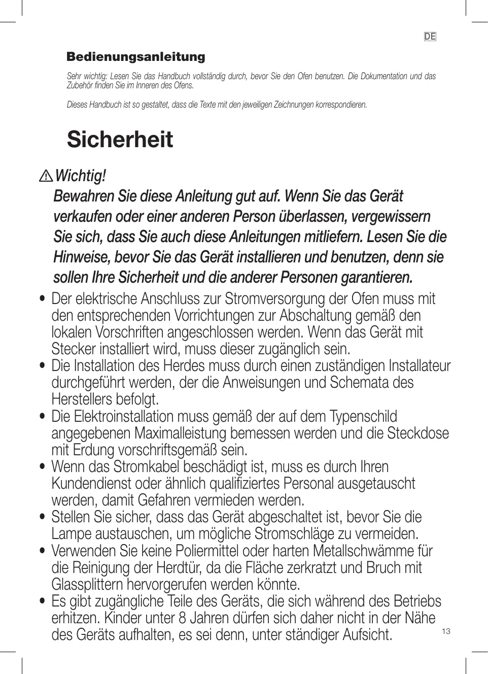 • Dieses Gerät kann von Kindern ab 8 Jahren und Personen verwendet mit verminderten physischen, sensoriellen oder geistigen Fähigkeiten oder mangelnder Erfahrung und Kenntnis benutzt werden, sofern sie eine angemessene Feststellung des Modells L’installation du four doit être confiée à un installateur agréé qui suivra les instructions et les schémas du fabricant. L’installation électrique doit être dimensionnée à la puissance maximale indiquée sur la plaque signalétique et la prise électrique équipée d’une mise à la terre réglementaire. Si le câble électrique est endommagé, il doit être remplacé par un technicien du service après-vente ou toute autre personne qualifiée afin d’éviter tout danger. S’assurer que l’appareil est débranché avant de remplacer la lampe pour éviter un éventuel choc électrique. Ne pas utiliser de produits de nettoyage abrasifs ou d’éponges métalliques dures pour nettoyer la porte du four, car vous risquer de la rayer et de provoquer la cassure en petits morceaux du verre. Pendant le fonctionnement de l’appareil, certaines parties accessibles peuvent devenir chaudes. Veiller à éloigner les enfants de moins de 8 19