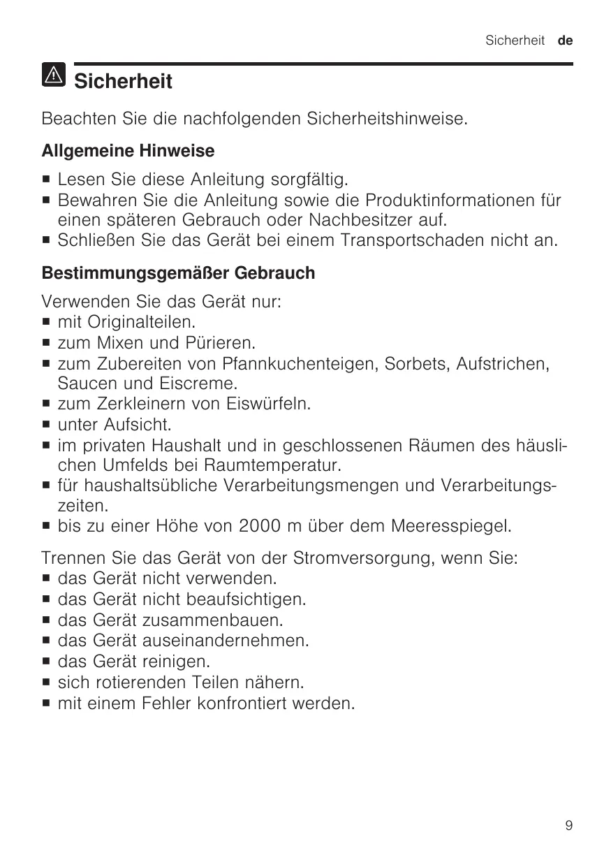 Sicherheit Beachten Sie die nachfolgenden Sicherheitshinweise. Allgemeine Hinweise ¡ Lesen Sie diese Anleitung sorgfältig. ¡ Bewahren Sie die Anleitung sowie die Produktinformationen für einen späteren Gebrauch oder Nachbesitzer auf. ¡ Schließen Sie das Gerät bei einem Transportschaden nicht an. Bestimmungsgemäßer Gebrauch Verwenden Sie das Gerät nur: ¡ mit Originalteilen. ¡ zum Mixen und Pürieren. ¡ zum Zubereiten von Pfannkuchenteigen, Sorbets, Aufstrichen, Saucen und Eiscreme. ¡ zum Zerkleinern von Eiswürfeln. ¡ unter Aufsicht. ¡ im privaten Haushalt und in geschlossenen Räumen des häuslichen Umfelds bei Raumtemperatur. ¡ für haushaltsübliche Verarbeitungsmengen und Verarbeitungszeiten. ¡ bis zu einer Höhe von 2000 m über dem Meeresspiegel. Trennen Sie das Gerät von der Stromversorgung, wenn Sie: ¡ das Gerät nicht verwenden. ¡ das Gerät nicht beaufsichtigen. ¡ das Gerät zusammenbauen. ¡ das Gerät auseinandernehmen. ¡ das Gerät reinigen. ¡ sich rotierenden Teilen nähern. ¡ mit einem Fehler konfrontiert werden.