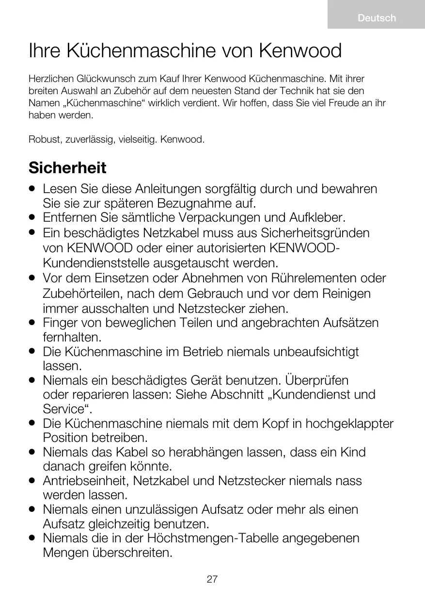 Si le cordon est endommagé, il doit être remplacé, pour des raisons de sécurité, par Kenwood ou par un réparateur agréé Kenwood. Éteignez et débranchez l’appareil avant d’adapter ou de retirer tout élément / accessoire, après l’utilisation et avant le nettoyage. N’approchez jamais vos doigts des éléments ou des accessoires installés en mouvement. Ne laissez jamais le robot pâtissier multifonction sans surveillance lorsqu’il fonctionne. N’utilisez jamais un appareil endommagé. Faites-le vérifier ou réparer : reportez-vous à la rubrique “ service après-vente “. Ne faites jamais fonctionner votre robot pâtissier multifonction avec la tête en position levée. Ne laissez jamais le cordon pendre de telle façon qu’un enfant puisse s’en saisir. Veillez à ne jamais mouiller le bloc moteur, le cordon d’alimentation ou la prise. N’utilisez jamais un accessoire non agréé ou plus d’un seul accessoire à la fois. Ne dépassez jamais les quantités stipulées dans le tableau indiquant les quantités maximales. 18