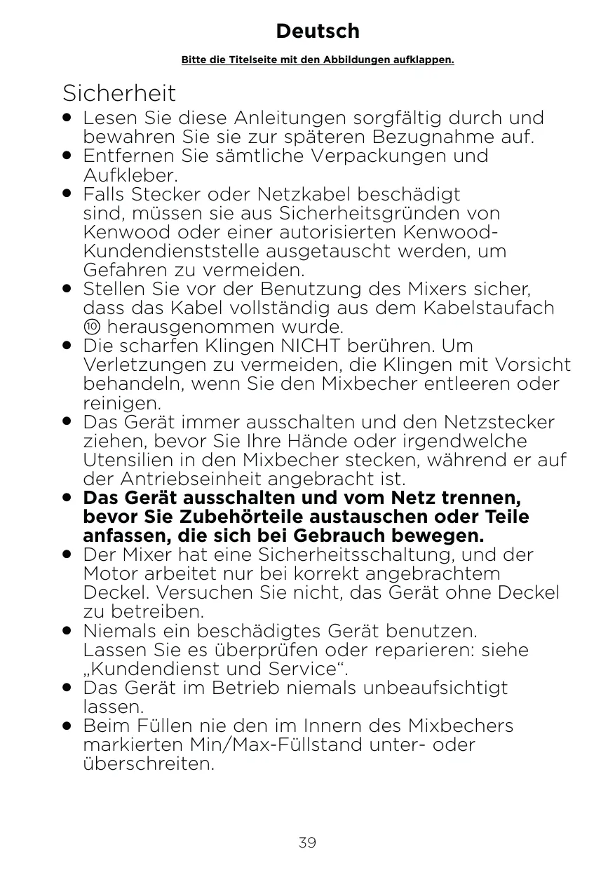 Lesen Sie diese Anleitungen sorgfältig durch und bewahren Sie sie zur späteren Bezugnahme auf. O Entfernen Sie sämtliche Verpackungen und Aufkleber. O Falls Stecker oder Netzkabel beschädigt sind, müssen sie aus Sicherheitsgründen von Kenwood oder einer autorisierten KenwoodKundendienststelle ausgetauscht werden, um Gefahren zu vermeiden. O Stellen Sie vor der Benutzung des Mixers sicher, dass das Kabel vollständig aus dem Kabelstaufach 10 herausgenommen wurde. O Die scharfen Klingen NICHT berühren. Um Verletzungen zu vermeiden, die Klingen mit Vorsicht behandeln, wenn Sie den Mixbecher entleeren oder reinigen. O Das Gerät immer ausschalten und den Netzstecker ziehen, bevor Sie Ihre Hände oder irgendwelche Utensilien in den Mixbecher stecken, während er auf der Antriebseinheit angebracht ist. O Das Gerät ausschalten und vom Netz trennen, bevor Sie Zubehörteile austauschen oder Teile anfassen, die sich bei Gebrauch bewegen. O Der Mixer hat eine Sicherheitsschaltung, und der Motor arbeitet nur bei korrekt angebrachtem Deckel. Versuchen Sie nicht, das Gerät ohne Deckel zu betreiben. O Niemals ein beschädigtes Gerät benutzen. Lassen Sie es überprüfen oder reparieren: siehe „Kundendienst und Service“. O Das Gerät im Betrieb niemals unbeaufsichtigt lassen. O Beim Füllen nie den im Innern des Mixbechers markierten Min/Max-Füllstand unter- oder überschreiten. O